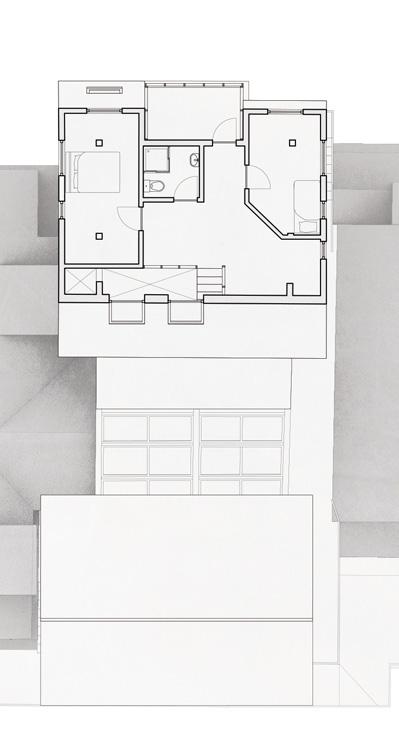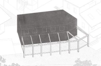 The ground floor and basements of the existing homes are retrofit with artist studios and the front porches are altered to connect the in-filled common spaces between them