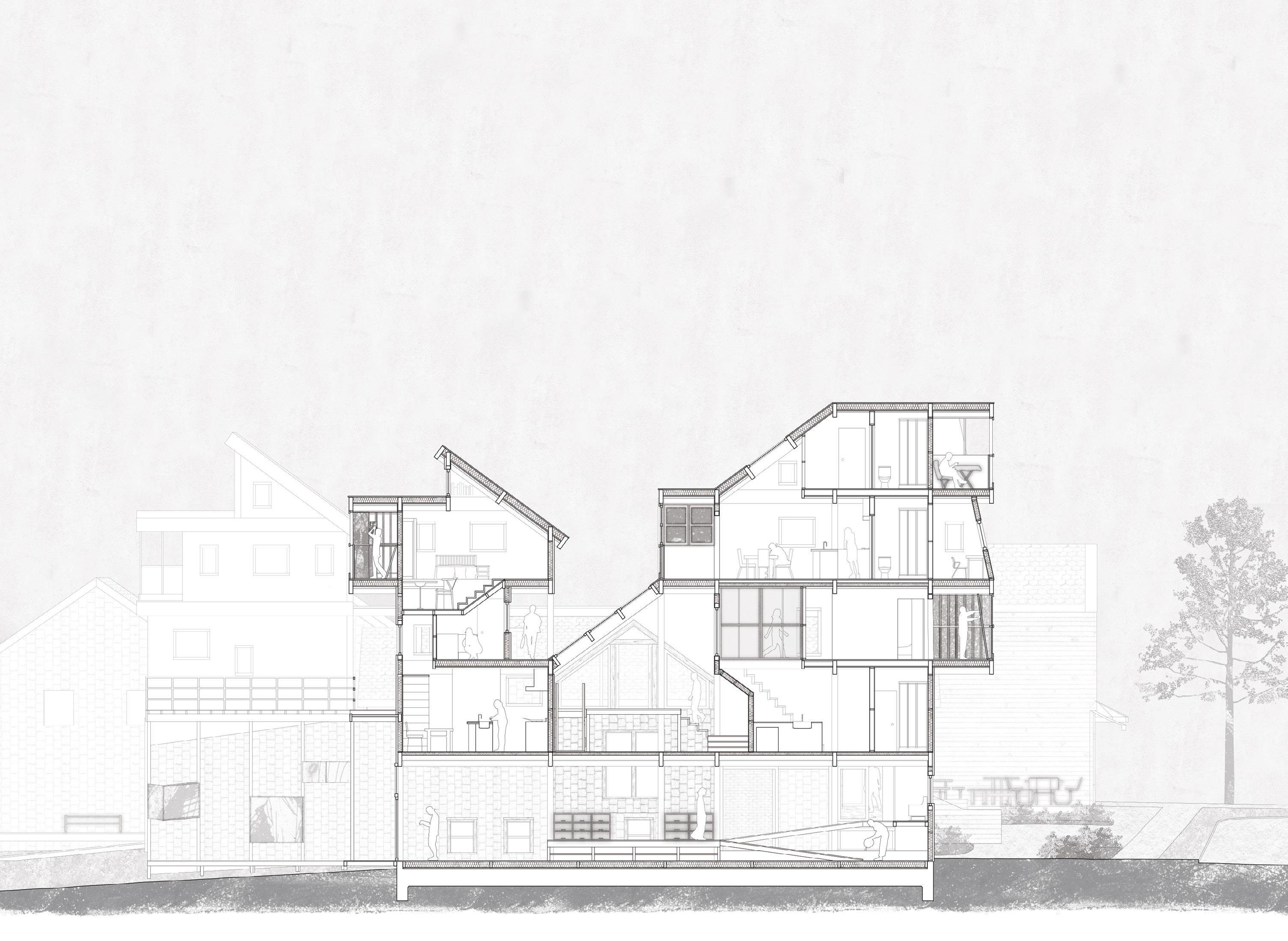 The project is an exploration into urban informalities, questioning how architecture can shift the nature of informality: as an unconformist means of necessity stemming from social and spatial constraints, towards authentic expressions of craft. Historically, Kitsilano has served as the center of the counterculture and hippie communities, where artist groups and young people would convert the older singlefamily homes into shared ‘hippie’ housing. Drawn by cheap rent, the neighbourhood became a platform where change was advocated through community and creative expression.