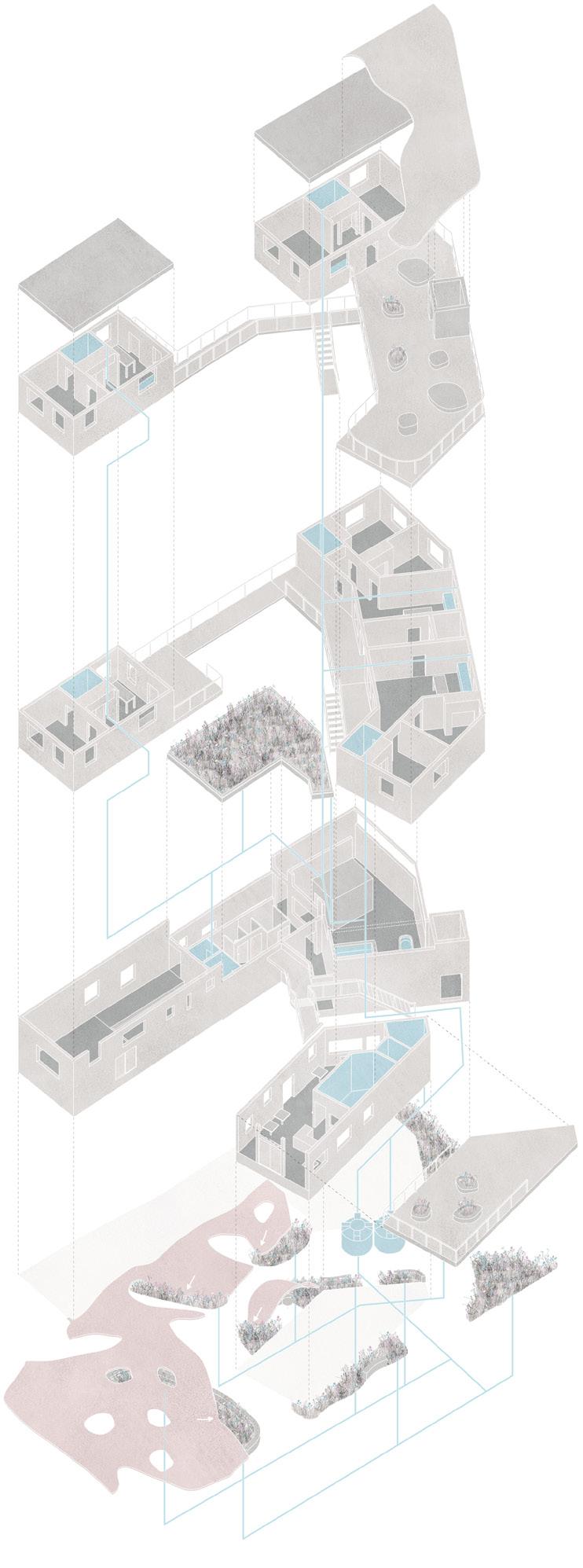 The 5 spaces each situate a particular step in the Asin Tibuok making process. The spaces accent the prominent senses of each step and its relation to nature and Filipino culture. Additionally, programs physically place one’s body amidst these natural entanglements, mimicking the material exchanges of the salt.
