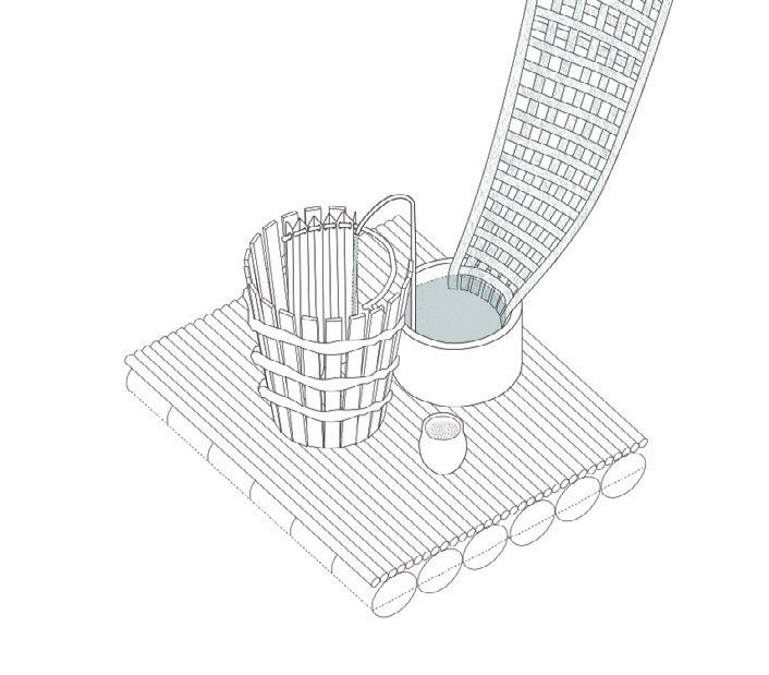 Tourists arrive by bamboo raft at the re-purposed Spanish colonial ruin (Loay Watch Tower.) Historically used to prohibit invaders, the tower now welcomes visitors, and serves as the beginning of the Asin Tibuok process. The inter-tidal condition of the traditional ‘Paril’ (salt-beds), where the husks soak, is adapted through new mobile pool typologies, nestled between the mangrove trees and the watch tower.