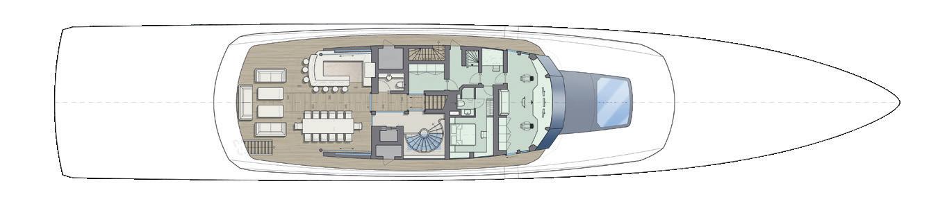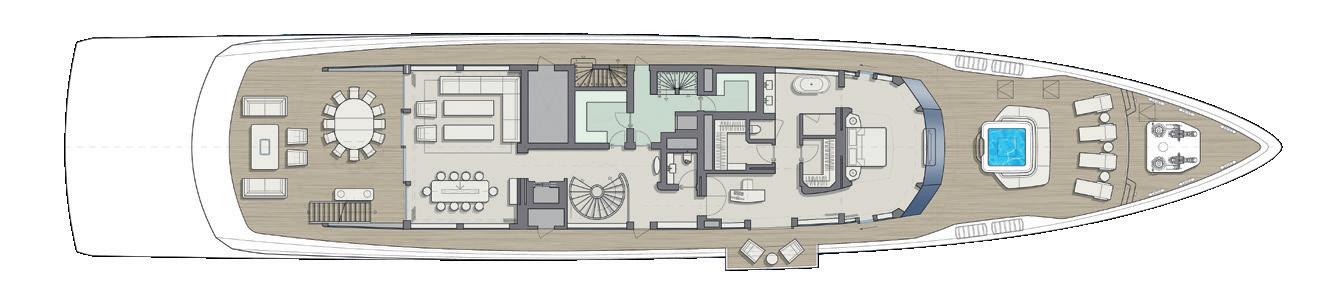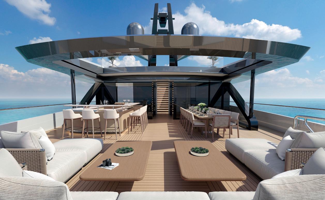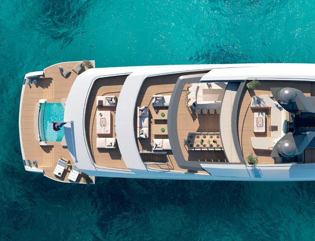 The yacht’s guiding principle is creating a relaxed lifestyle on the water, with an emphasis on watersports and fitness. Flexible living and working areas offer a seamless indoor-outdoor experience.