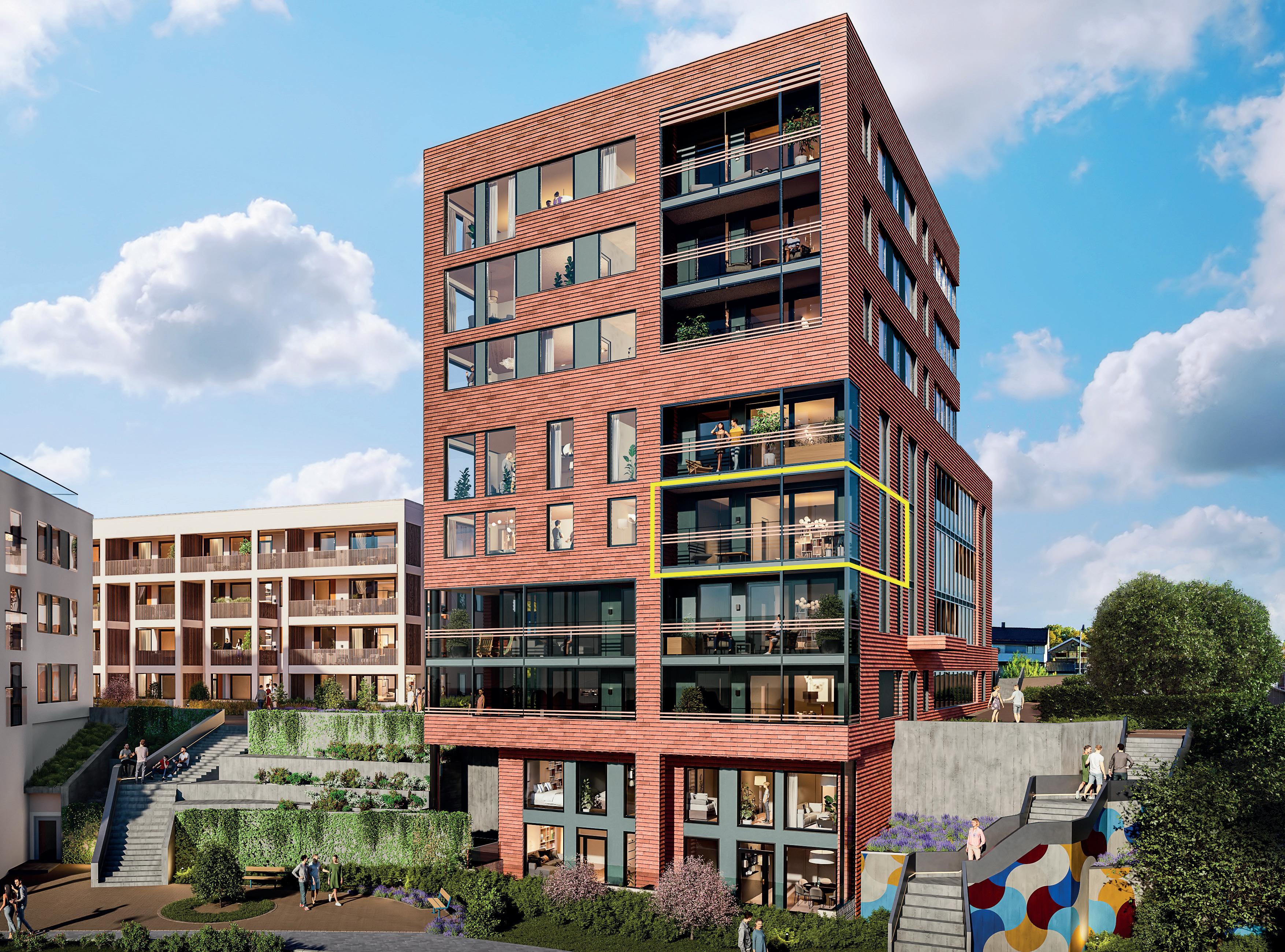 Vi er nå kommet til siste trinn, trinn 5. Prosjektet beveger seg videre opp i høyden. Historien kjenner du kanskje, men nå fortsetter den med nye elementer. Det er kommet til nye arkitekter på trinn fire og fem med nye visjoner og materialer - men med den samme utsøkte kvaliteten. Et stort parkområde mellom byggene inviterer til varme sommerkvelder, og den friske lukten av sjø, vind og vann blir en del av hverdagen her på Øvre Nyhavna. Her kan du tusle fra egen dør, gjennom grøntdraget – og helt ned til Trondheimsfjorden.