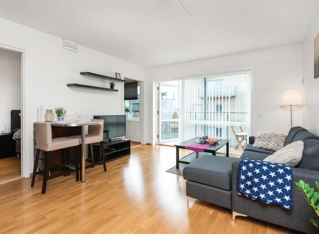 Dette er en styling som passer for en tom bolig. Her leverer vi alt av møbler, interiør og tekstiler, og styler slik at boligen ser innbydende ut til foto og visning.
