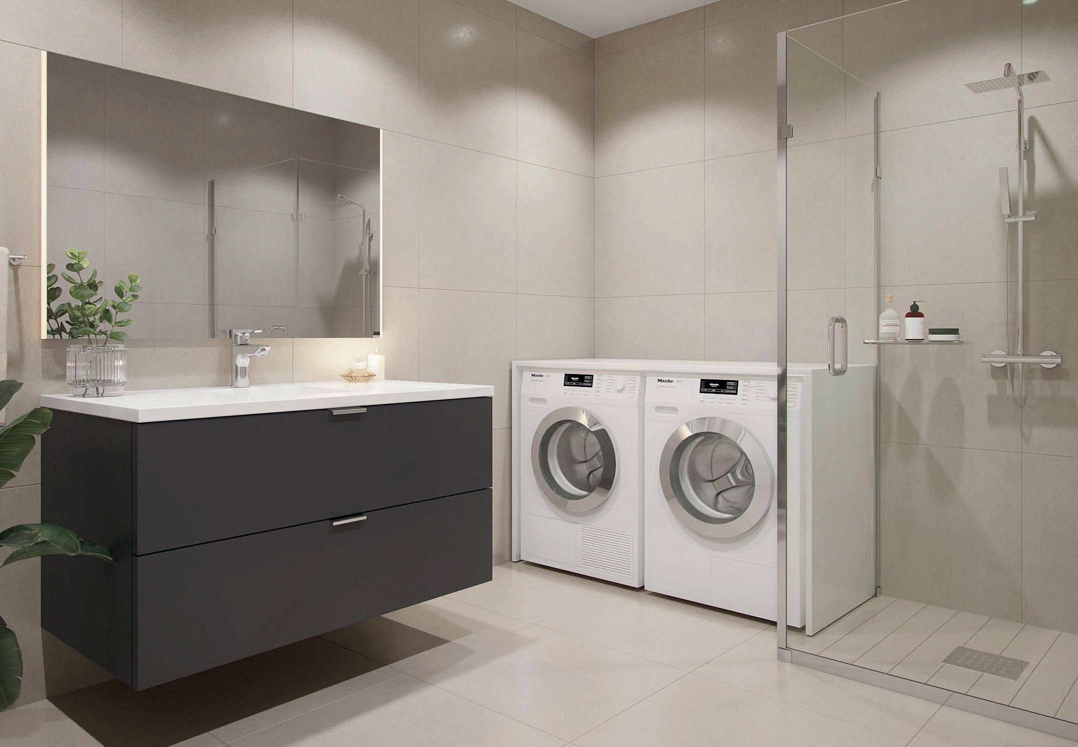 - Kjøkken- og baderomsinnredning fra KVIK, der du selv kan velge mellom svart og beige løsninger