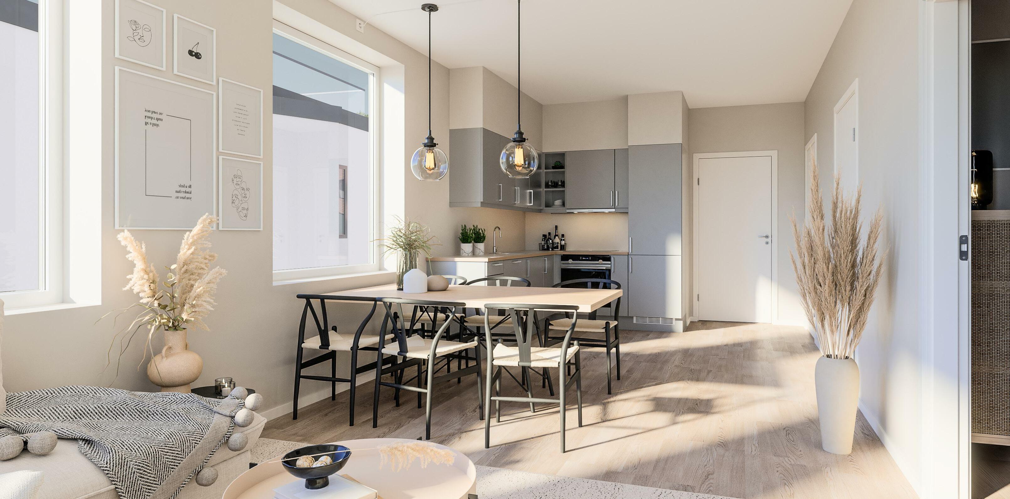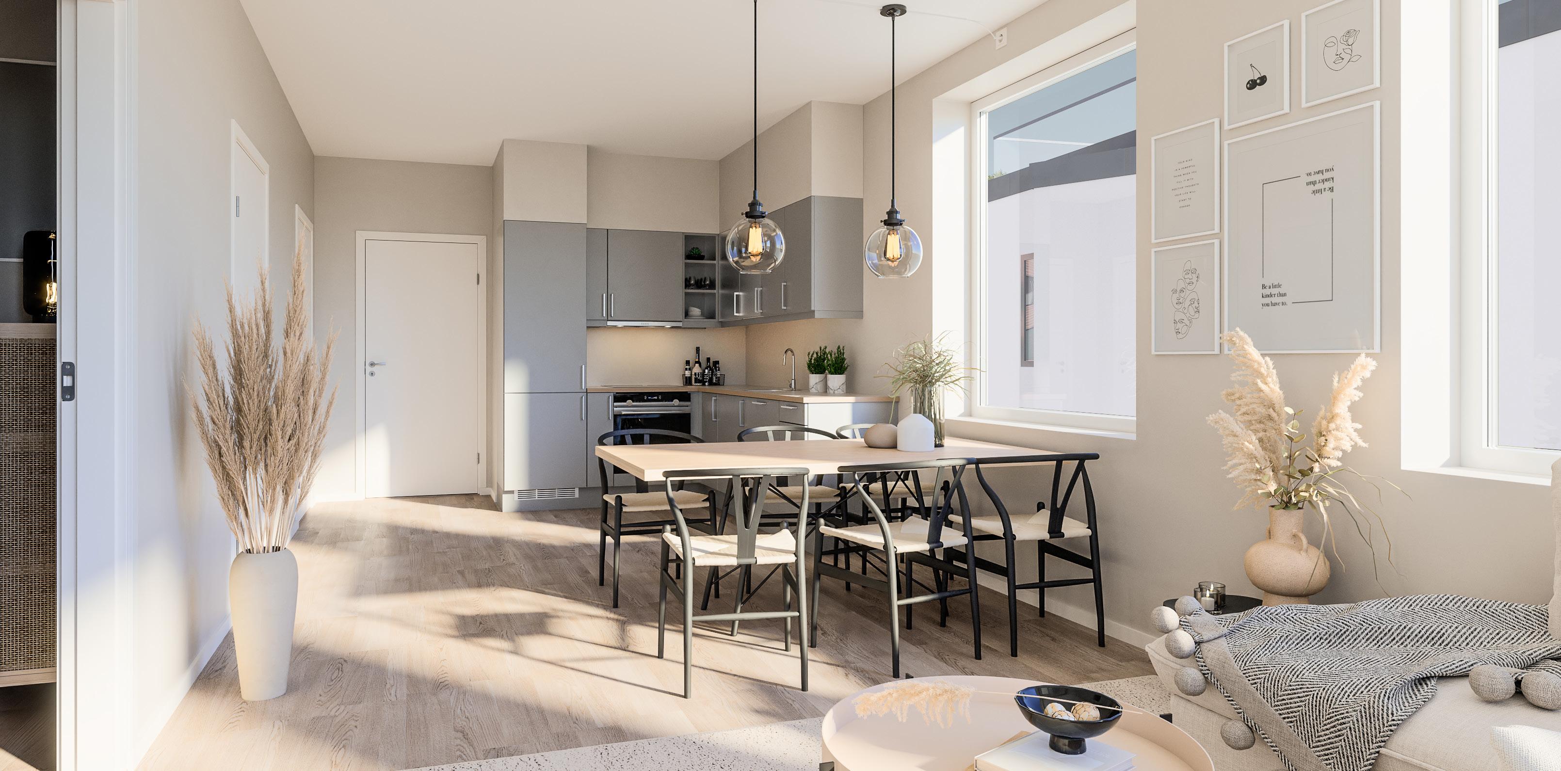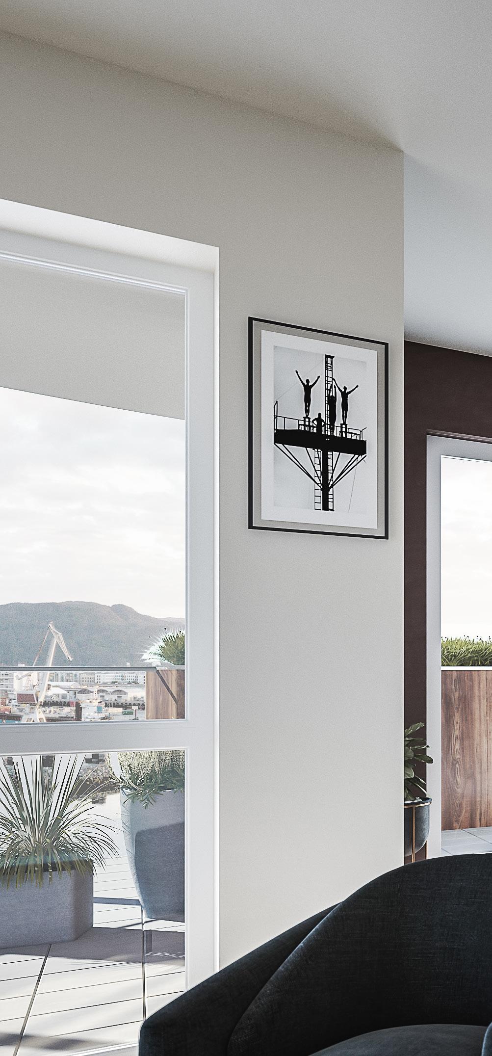 Leilighetene skal selvsagt gi deg den samme gode følelsen. Med smarte løsninger, vakre, materialer og mye variasjon ligger alt til rette for å lage deg ditt fristed. Store vinduer slipper naturlig lys inn i de romslige stuene.