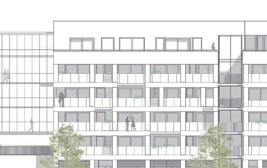 Store vinduer og dører med glass skaper nærkontakt til omgivelsene, og slipper inn godt med dagslys. Sammen med raus takhøyde gir dette boligene en opplevelse av høy kvalitet. For å gi god plass til utemøbler og planter har vi tegnet inn romslige balkonger vendt mot vest og sørvest. Samtidig har vi sørget for god skjerming mot vær og vind. Boligene er hevet en etasje opp fra torget og kjøpesenteret. Det er tegnet inn en stor og frodig takhage med beplantning av høy kvalitet. Takhagen vil være tilgjenglig for alle, og kan nåes med trapper fra torget.