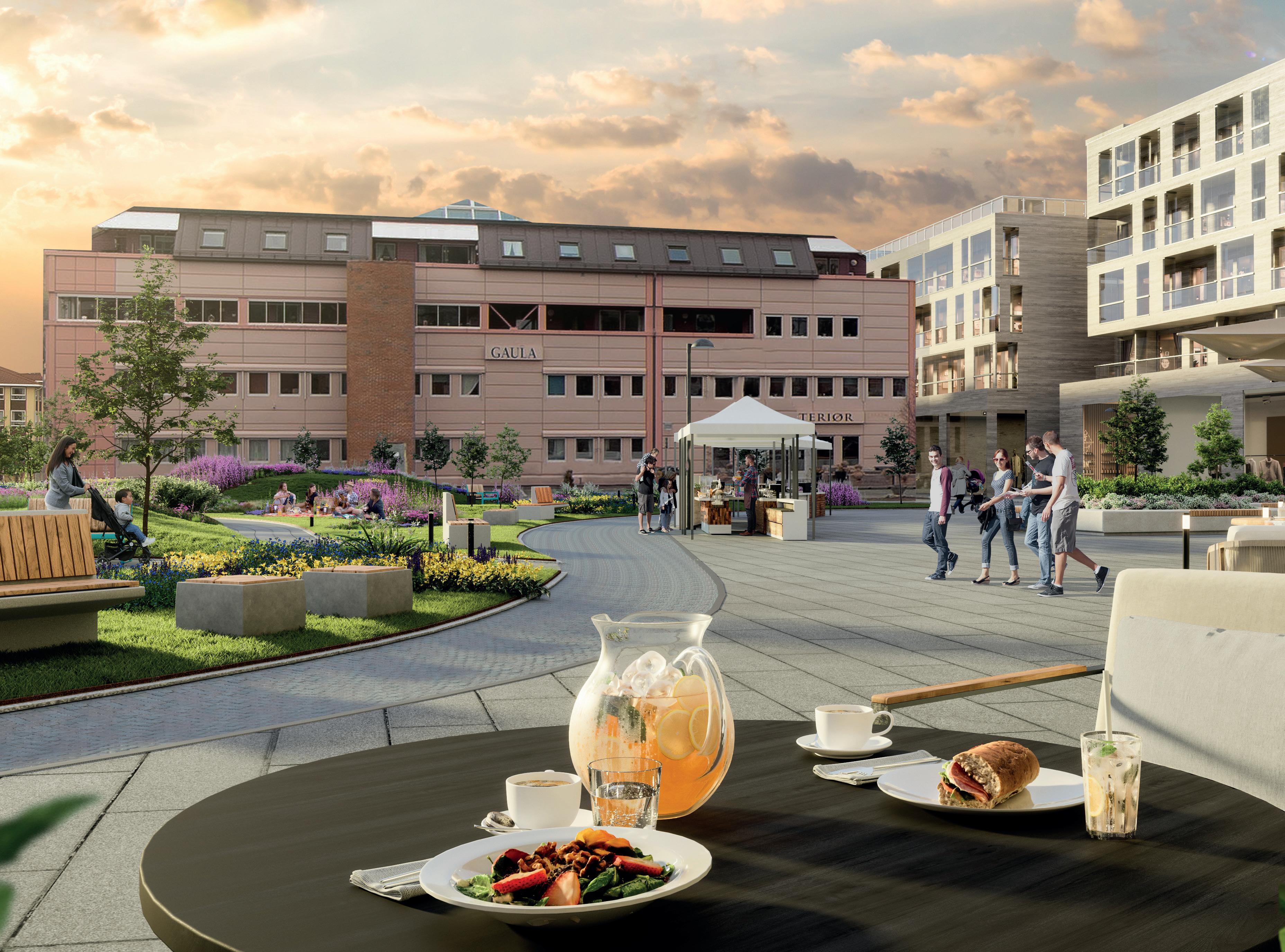 Et samlende sentrum med torg, vakre bygg, takhage, serveringsteder, uteservering og kjøpesenter.