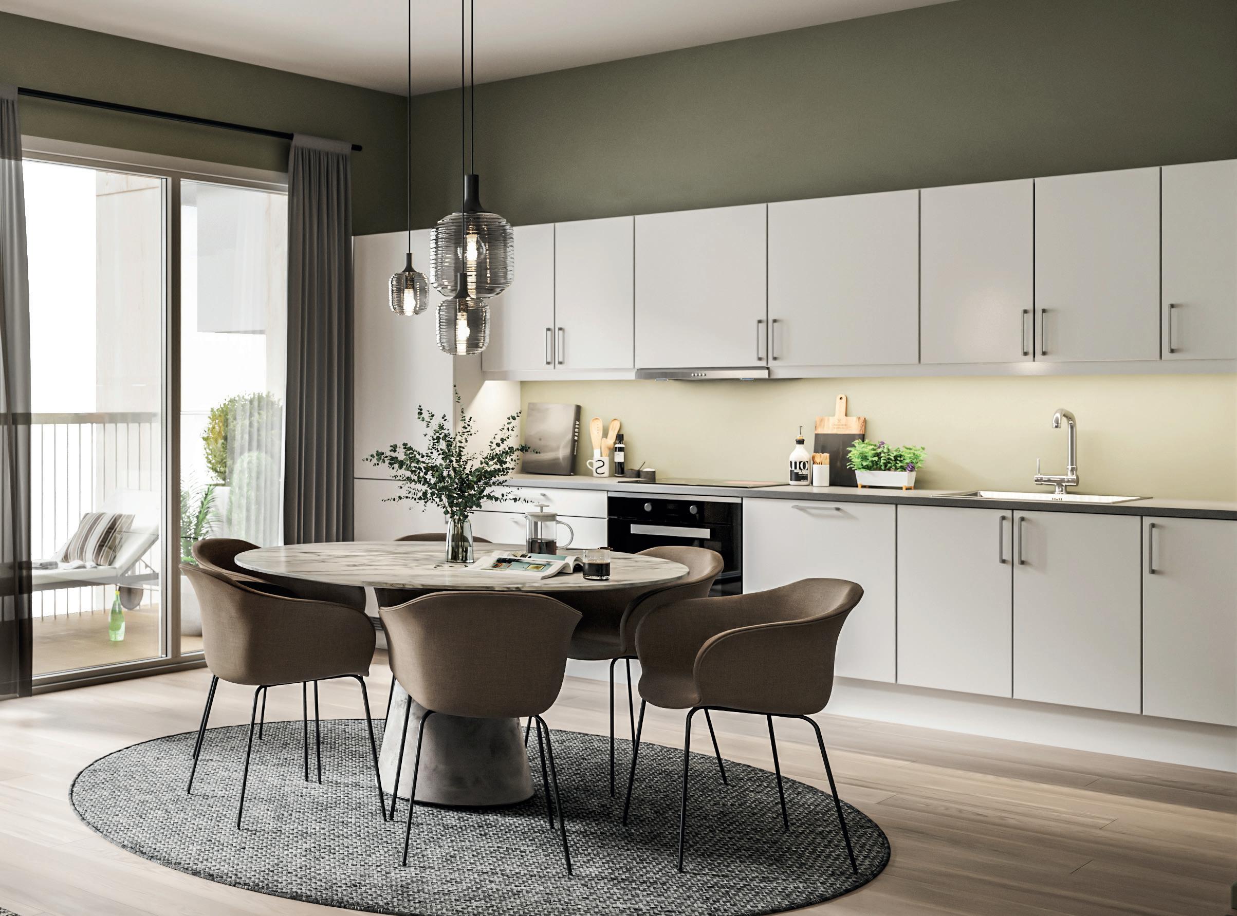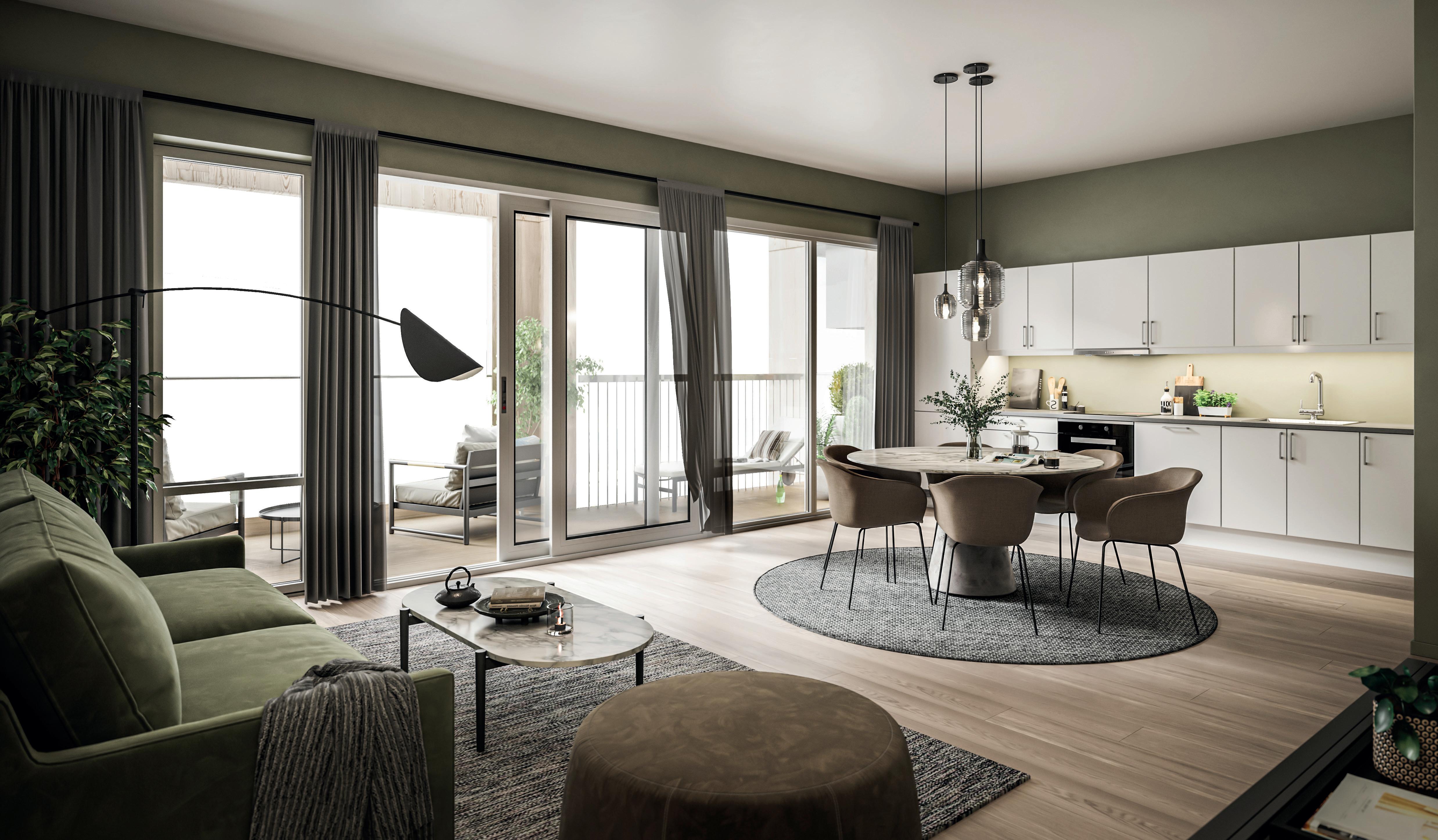 Alle bilder er av illustrativ karakter, endringer vil forekomme. Materialvalg og farger kan avvike og må evnt. bestilles som tilvalg om disse avviker fra standard leveranse angitt leveransebeskrivelsen vedlagt. Utsikt, balkongløsning, rekkverk og vindusløsning er kun illustrativ og vil variere fra etasje til etasje og bygg til bygg. Kjøkkenløsning kan avvike. Se etasjeplaner og kjøkkentegninger vedlagt i den komplette leveransebeskrivelse.