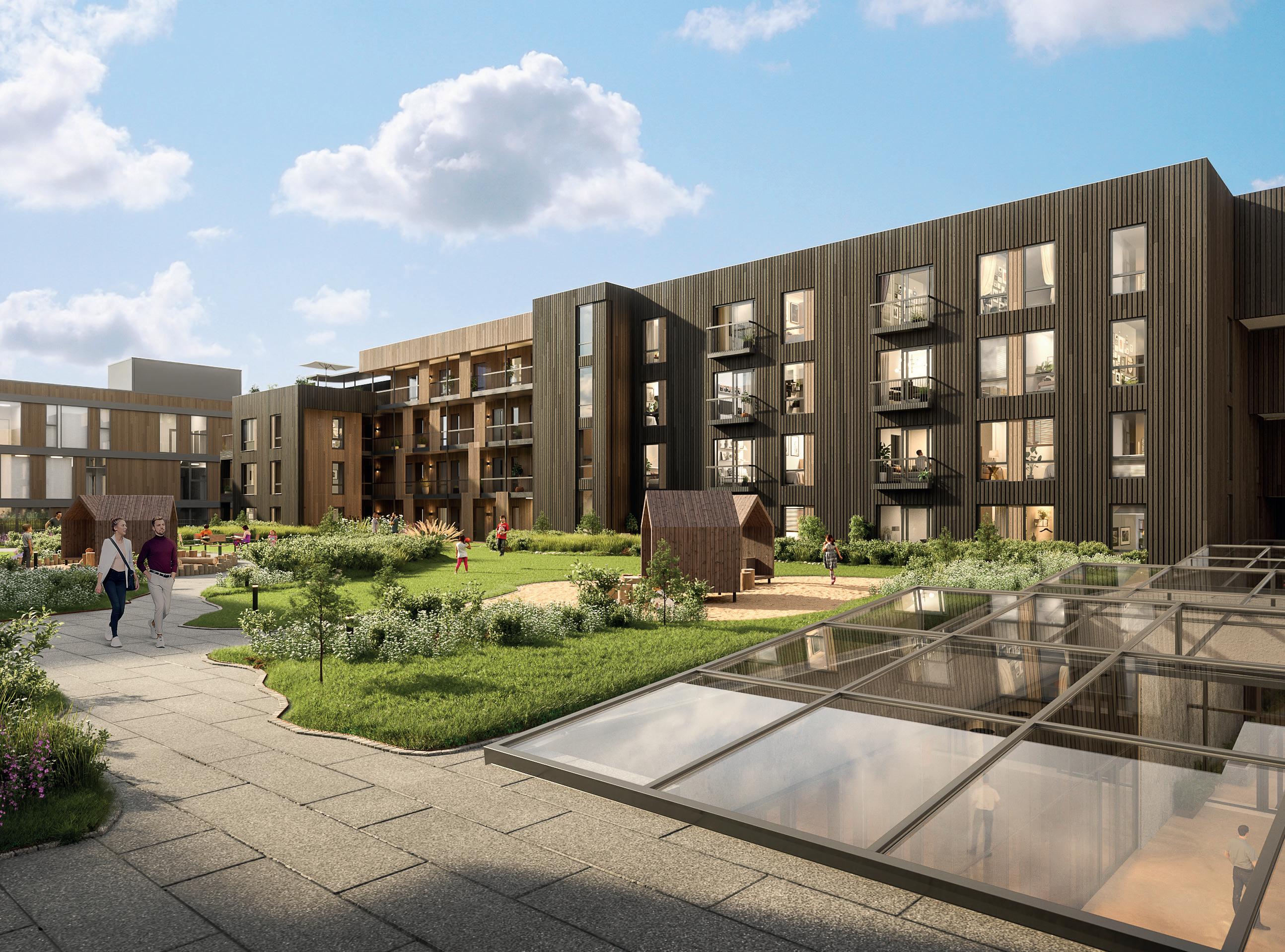 Moderne leiligheter på toppen av kjøpesenter med torg og takhage. Et handelssentrum med gode kollektivtilbud, kunst og kultur.
