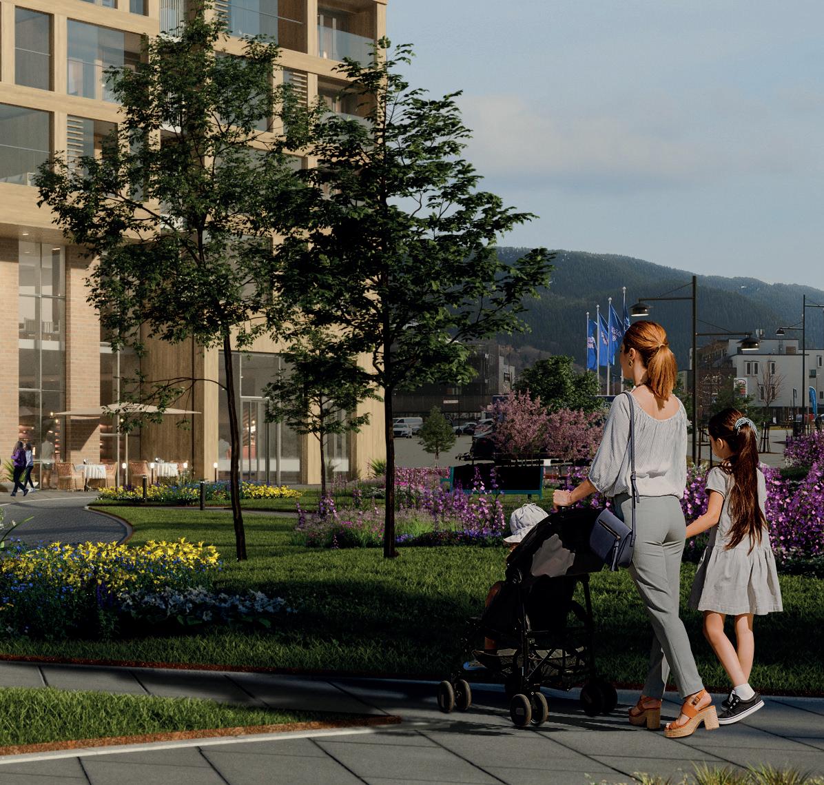Her kan du rusle rundt eller du kan sette deg ned med en god bok. Dette vil bli et sted hvor du kan la barna boltre seg på lekeplassen mens du tar en pust i bakken, eller nyter kaffekoppen omgitt av busker og vakre trær. Kjenn varmen fra sola mens du skuer utover den friske parken.