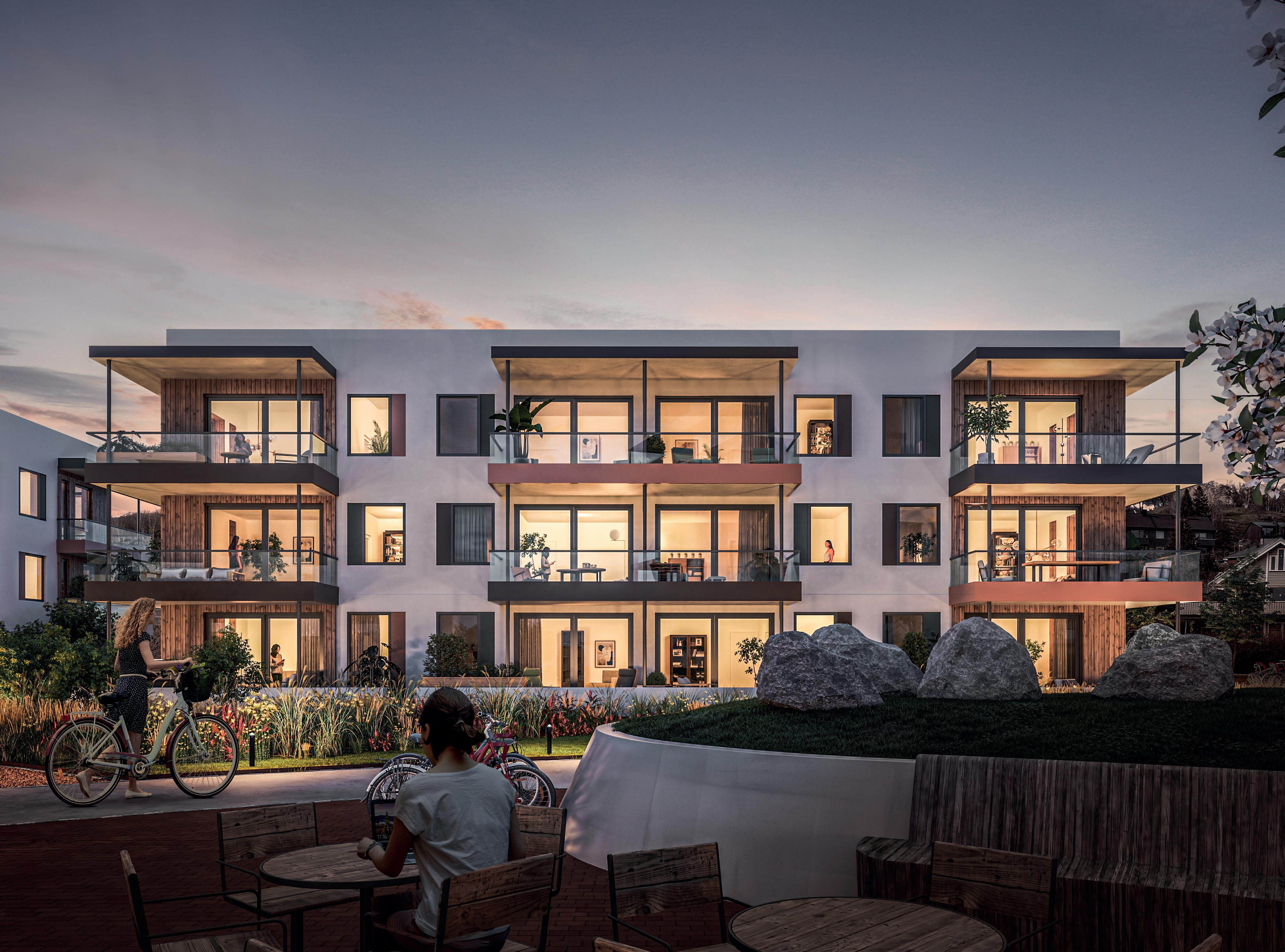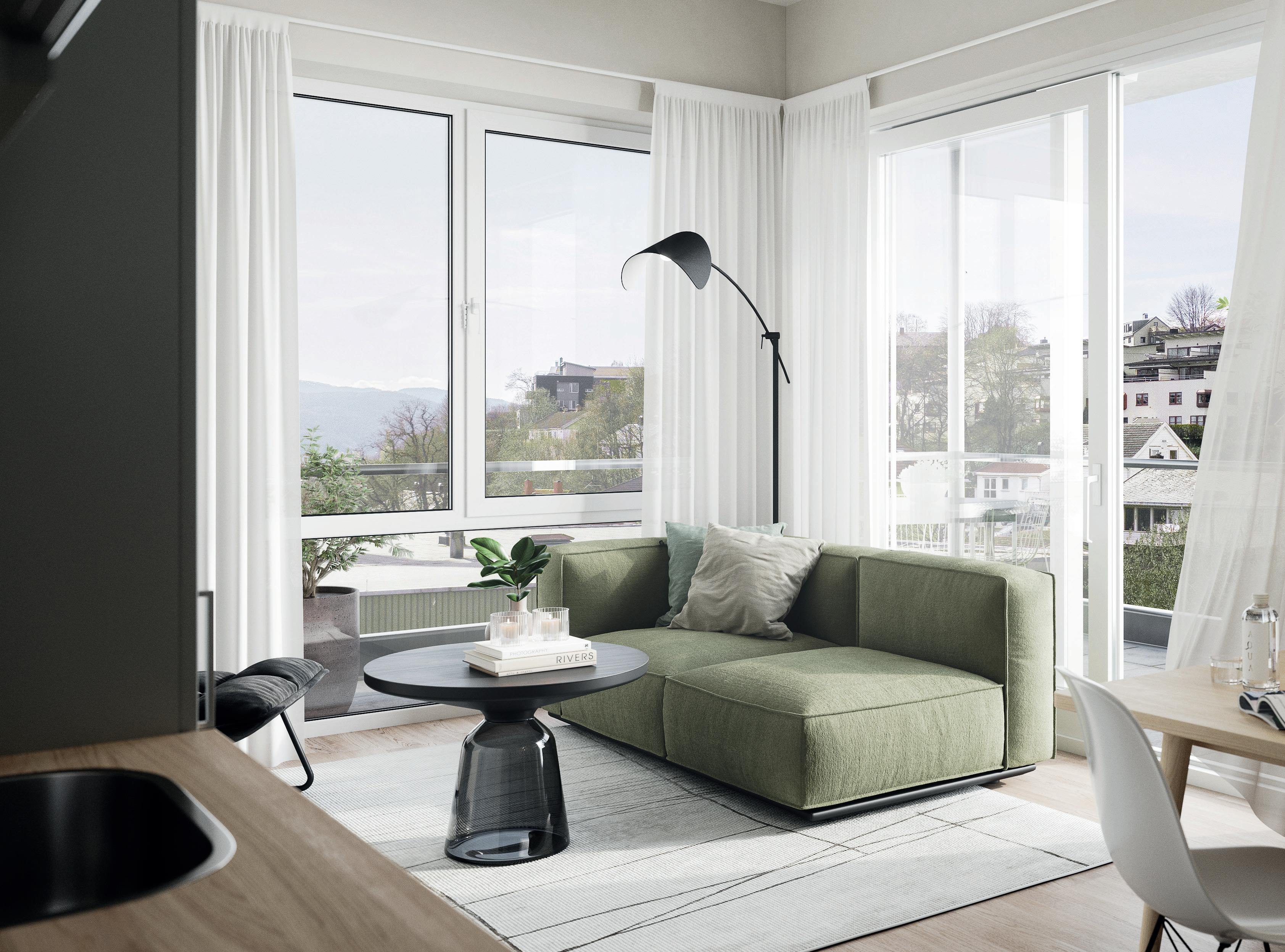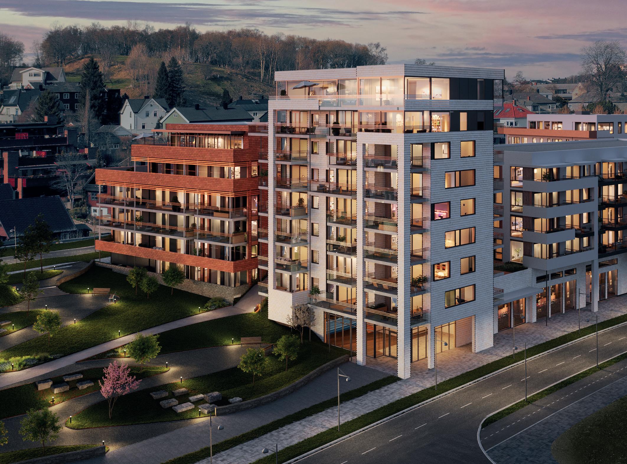 Alle bilder er av illustrativ karakter, endringer vil forekomme. Materialvalg og farger kan avvike og må evnt. bestilles som tilvalg om disse avviker fra standard leveranse angitt leveransebeskrivelsen vedlagt. Utsikt, balkongløsning, rekkverk og vindusløsning er kun illustrativ og vil variere fra etasje til etasje og bygg til bygg. Kjøkkenløsning kan avvike. Se etasjeplaner og kjøkkentegninger vedlagt i den komplette leveransebeskrivelse.