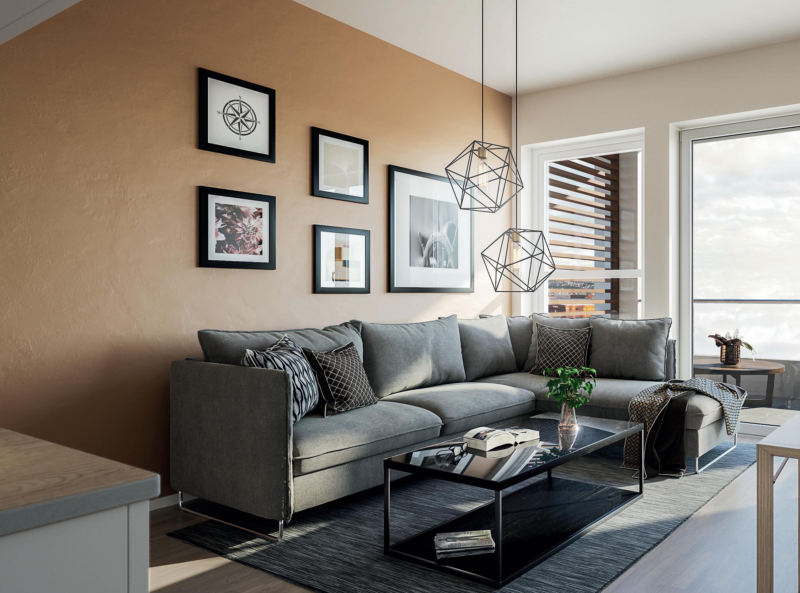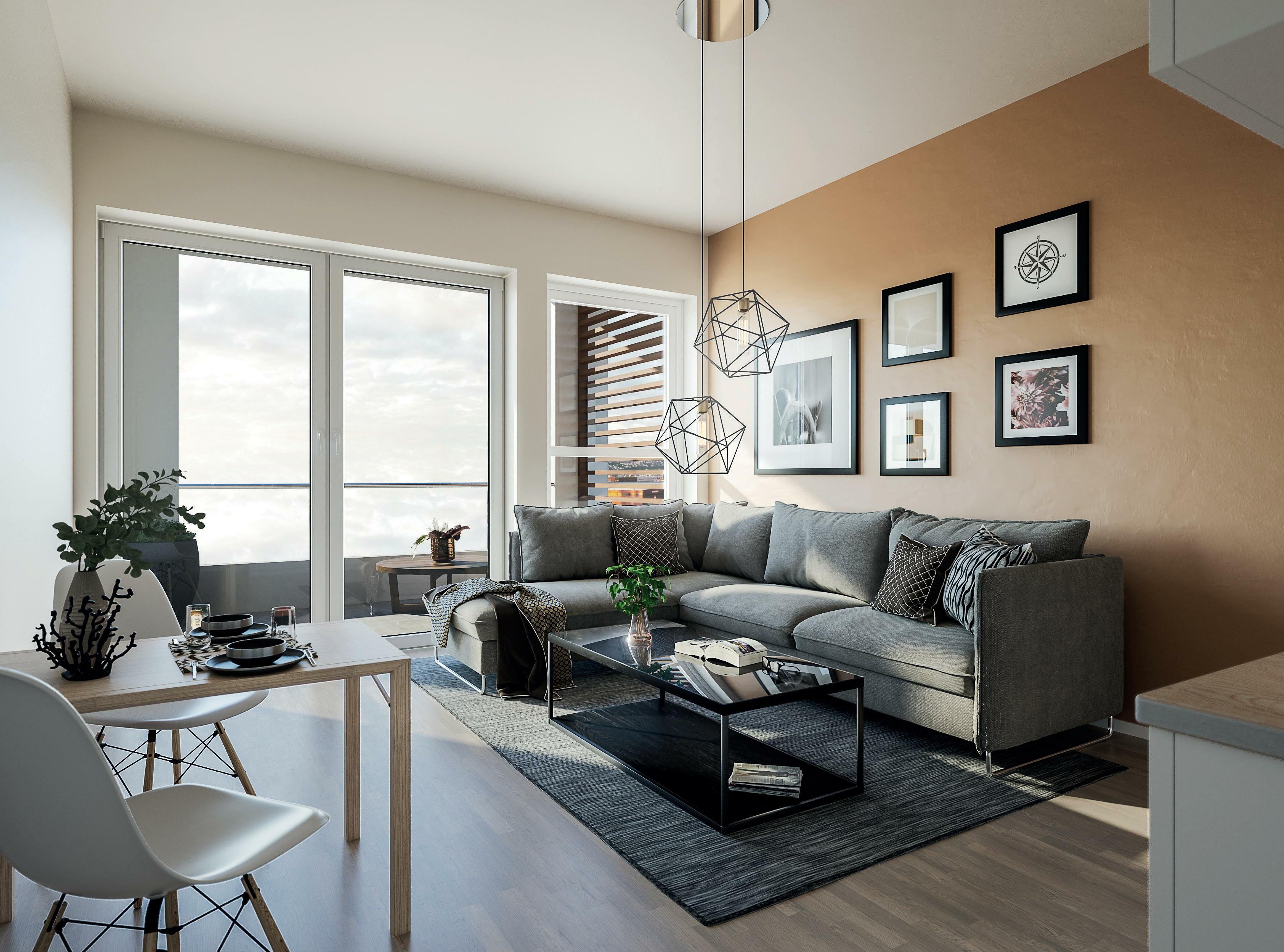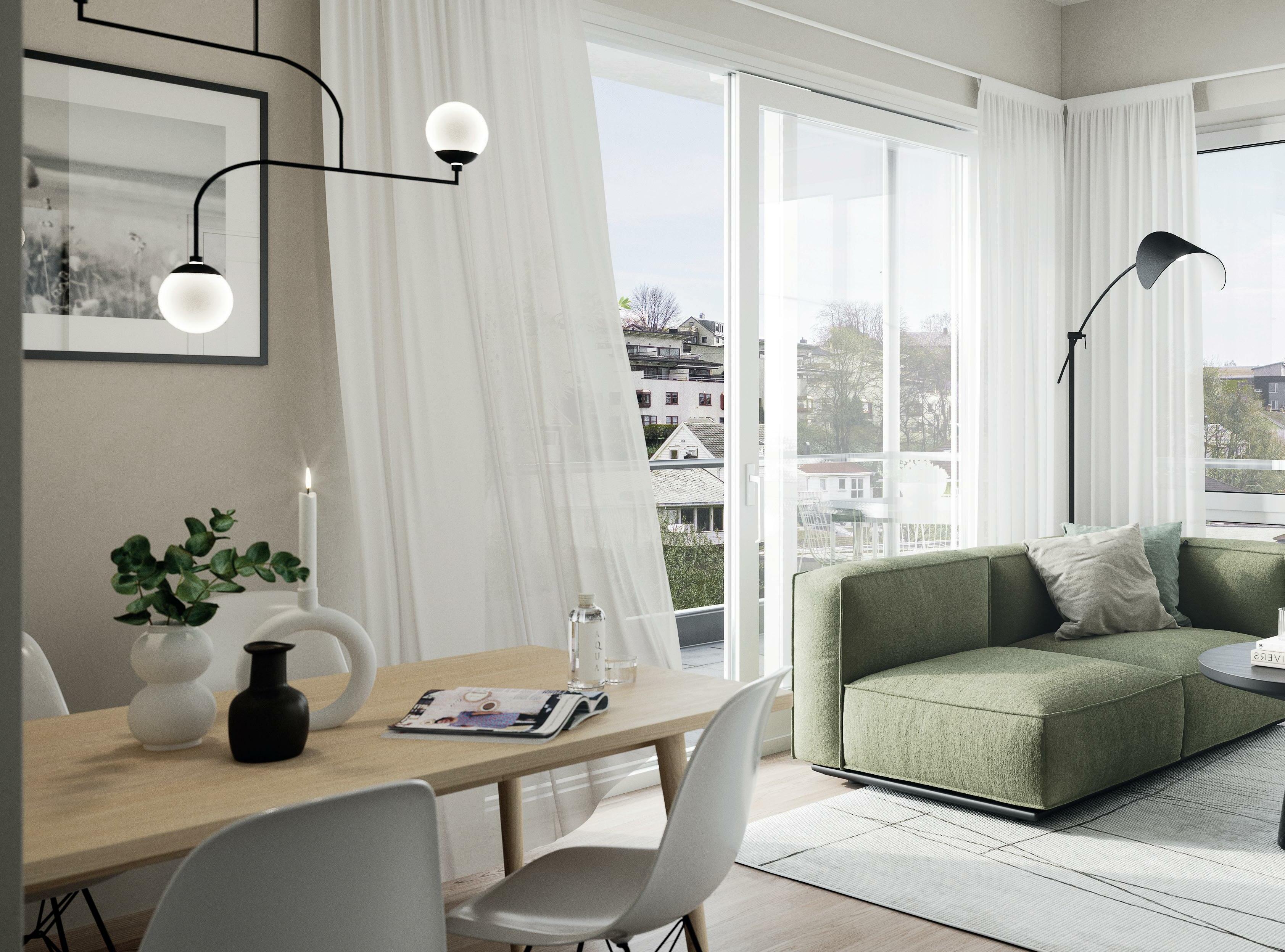 Alle bilder er av illustrativ karakter, endringer vil forekomme. Materialvalg og farger kan avvike og må evnt. bestilles som tilvalg om disse avviker fra standard leveranse angitt i leveransebeskrivelsen vedlagt. Utsikt, balkongløsning, rekkverk og vindusløsning er kun illustrativ og vil variere fra etasje til etasje og bygg til bygg. Kjøkkenløsning kan avvike. Se etasjeplaner og kjøkkentegninger vedlagt i den komplette leveransebeskrivelse.