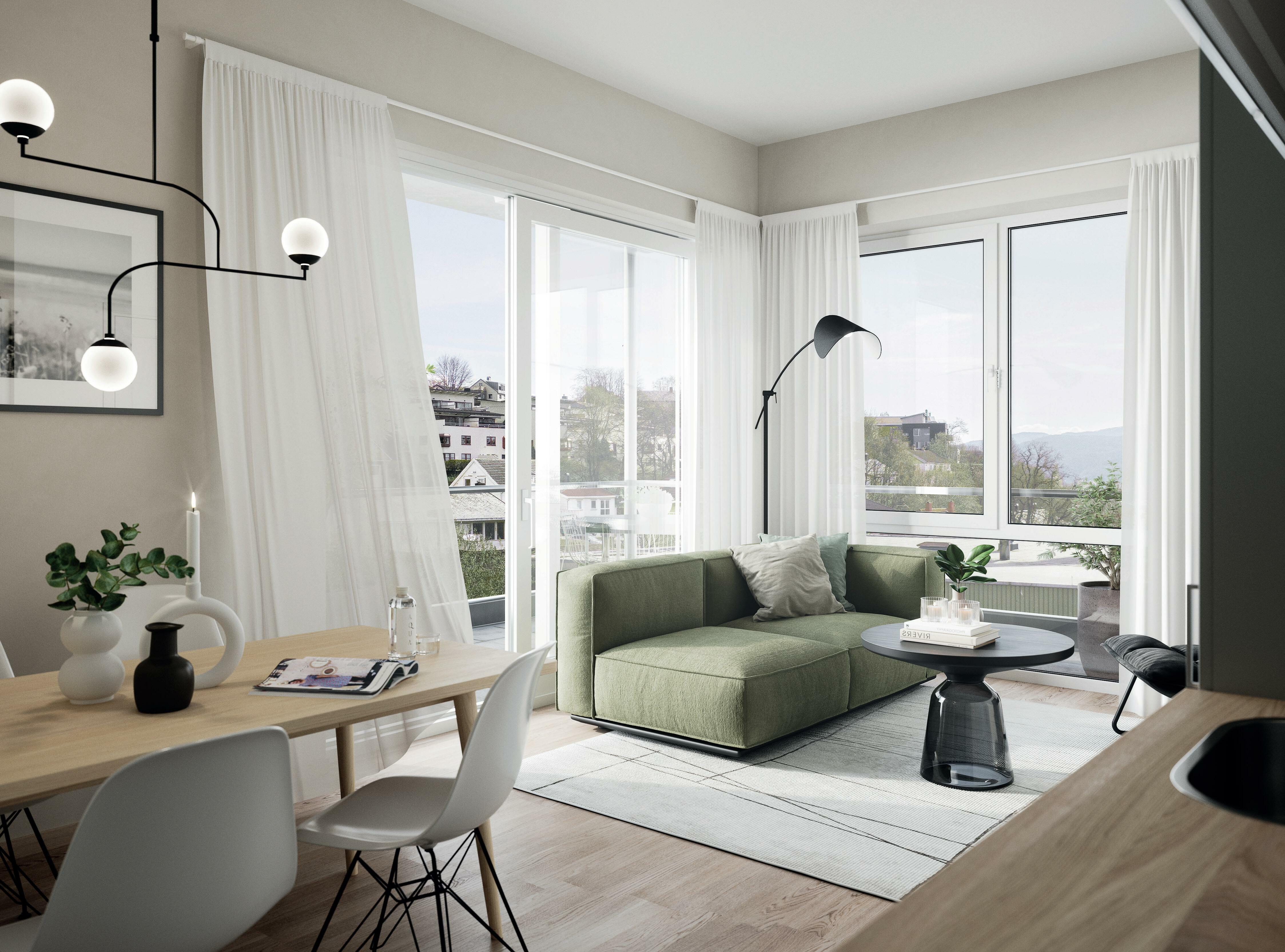 Alle bilder er av illustrativ karakter, endringer vil forekomme. Materialvalg og farger kan avvike og må evnt. bestilles som tilvalg om disse avviker fra standard leveranse angitt i leveransebeskrivelsen vedlagt. Utsikt, balkongløsning, rekkverk og vindusløsning er kun illustrativ og vil variere fra etasje til etasje og bygg til bygg. Kjøkkenløsning kan avvike. Se etasjeplaner og kjøkkentegninger vedlagt i den komplette leveransebeskrivelse.
