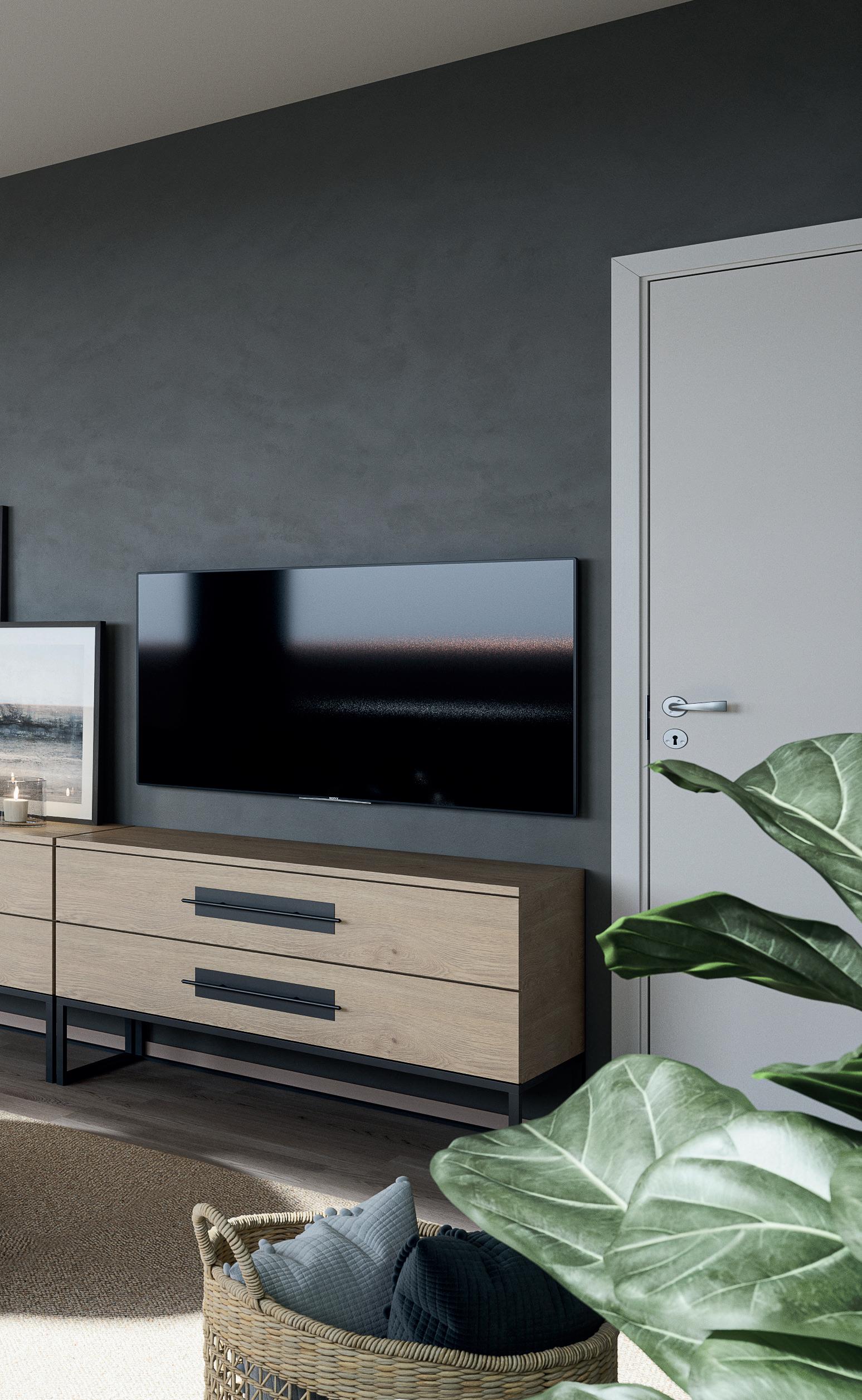 Dører innvendig i boligen leveres som glatte hvite. Dørvridere, låseskilt og skyvedørsbeslag (kopp) leveres forkrommet. Foringer og omramming leveres i tre/mdf-materiale