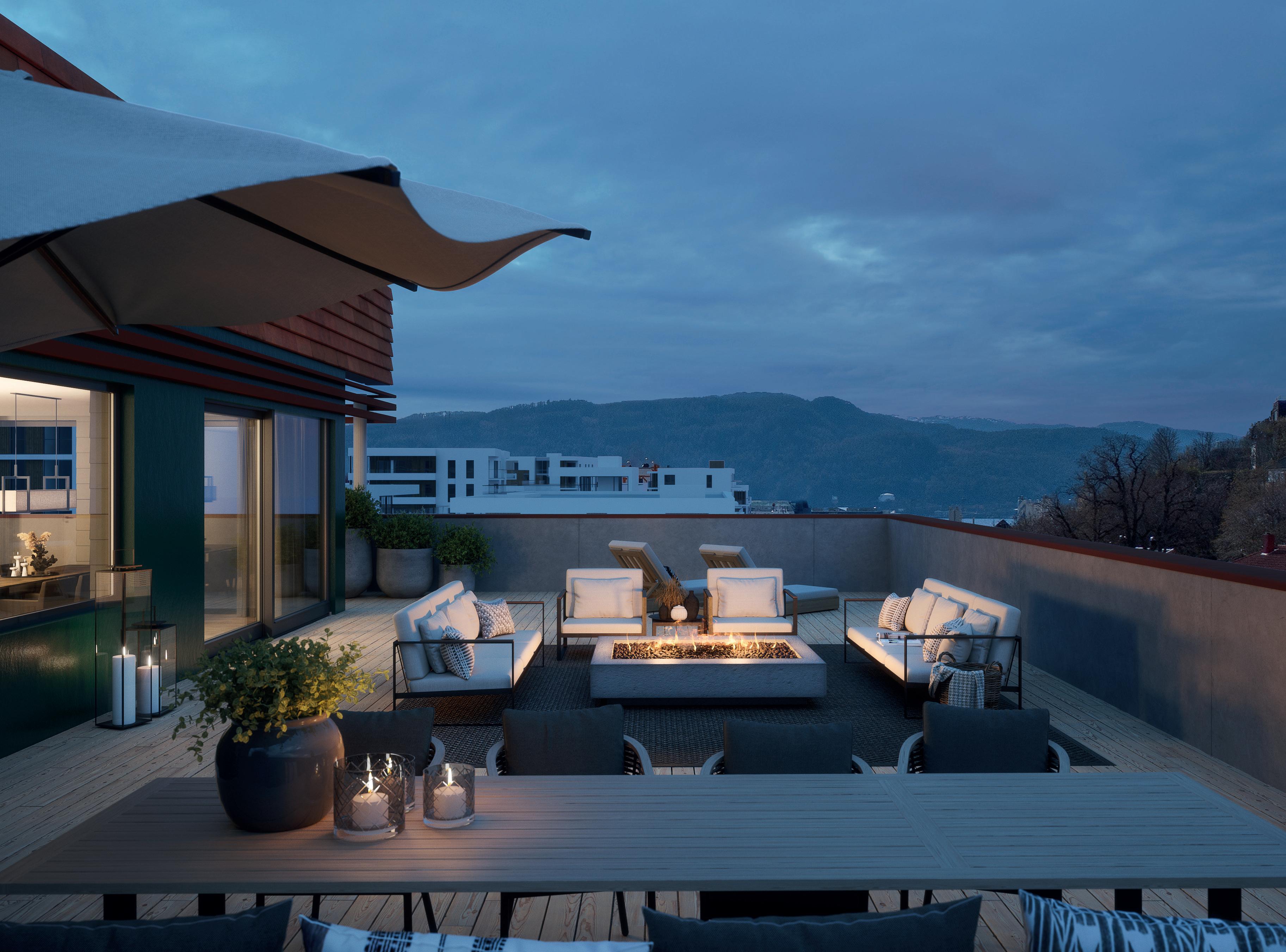Gulv på balkonger leveres med flis som angitt i romskjema. Rekkverk/håndløper på terrasse leveres i stål/glass. Balkonger vil kunne ha søyler i fremkant for å bære vekten av disse, disse er ikke inntegnet på illustrasjoner og fasadetegninger på dette stadiet av prosjektet.