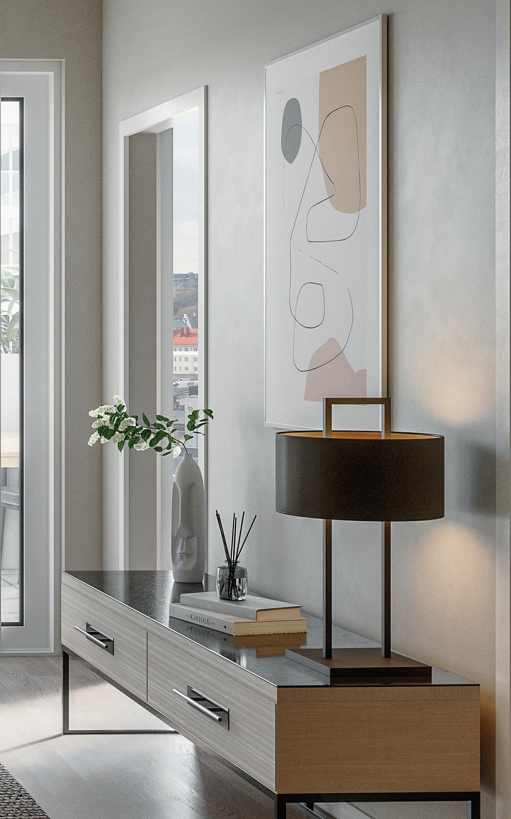 Alle bilder er av illustrativ karakter, endringer vil forekomme. Materialvalg og farger kan avvike og må evnt. bestilles som tilvalg om disse avviker fra standard leveranse angitt leveransebeskrivelsen vedlagt. Utsikt, balkongløsning, rekkverk og vindusløsning er kun illustrativ og vil variere fra etasje til etasje og bygg til bygg. Kjøkkenløsning kan avvike. Se etasjeplaner og kjøkkentegninger vedlagt i den komplette leveransebeskrivelse.