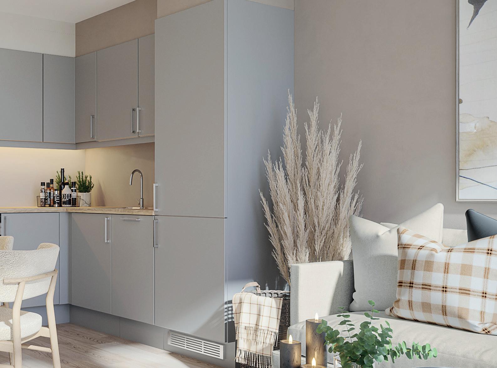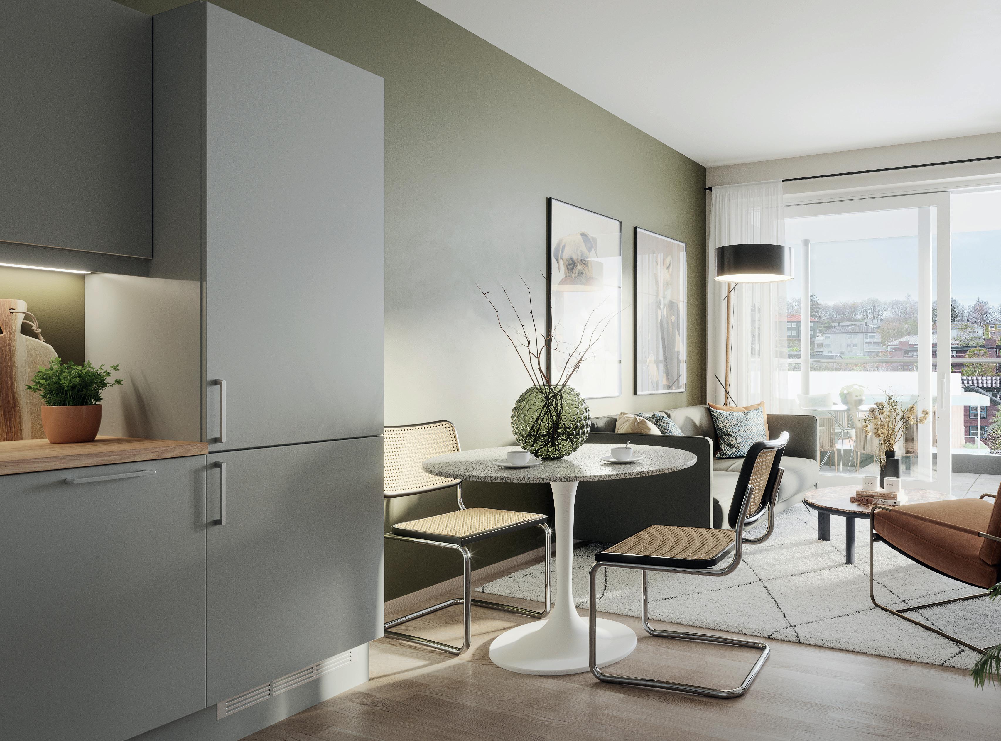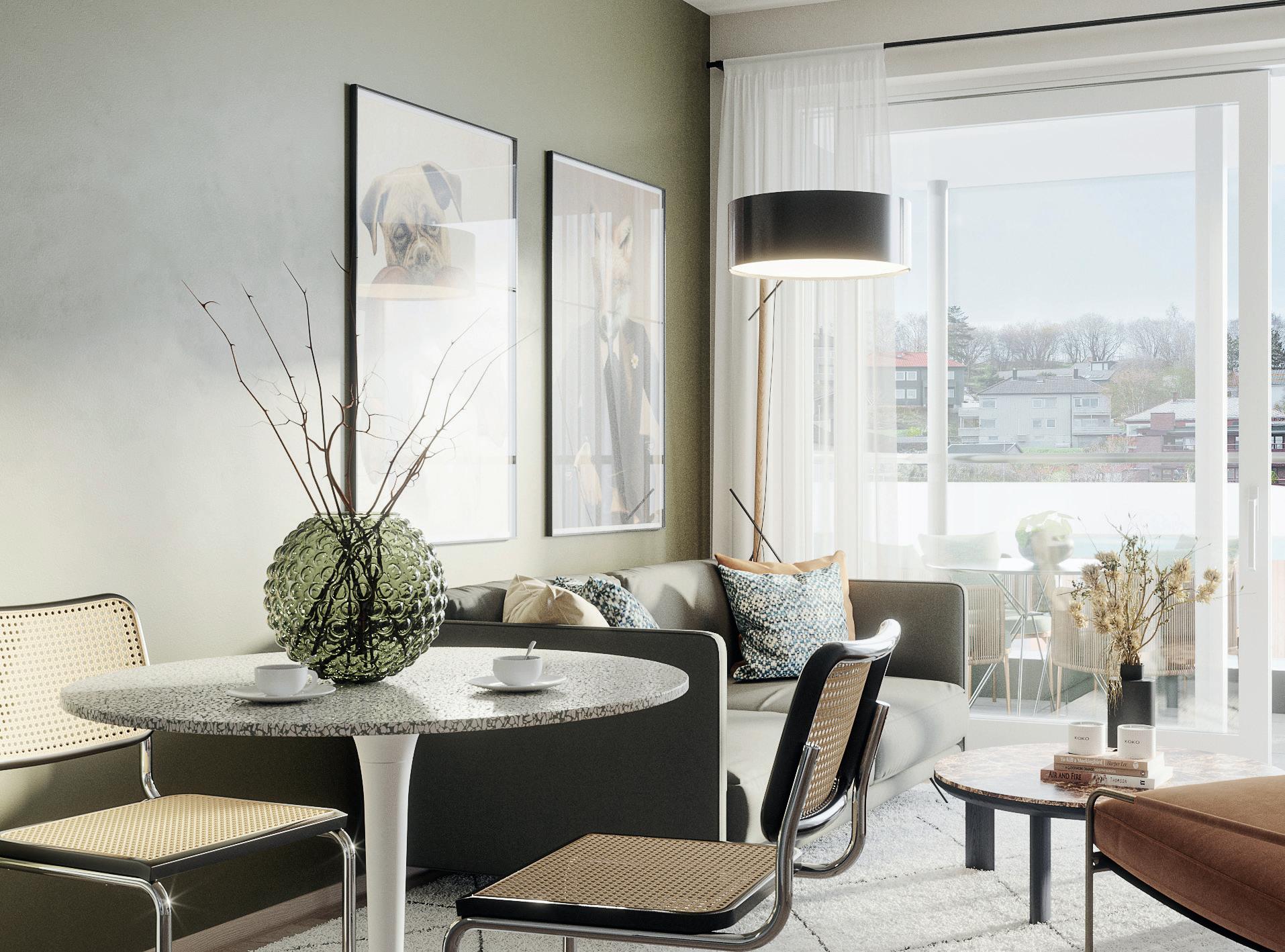 Alle bilder er av illustrativ karakter, endringer vil forekomme. Materialvalg og farger kan avvike og må evnt. bestilles som tilvalg om disse avviker fra standard leveranse angitt leveransebeskrivelsen vedlagt. Utsikt, balkongløsning, rekkverk og vindusløsning er kun illustrativ og vil variere fra etasje til etasje og bygg til bygg. Kjøkkenløsning kan avvike. Se etasjeplaner og kjøkkentegninger vedlagt i den komplette leveransebeskrivelse.