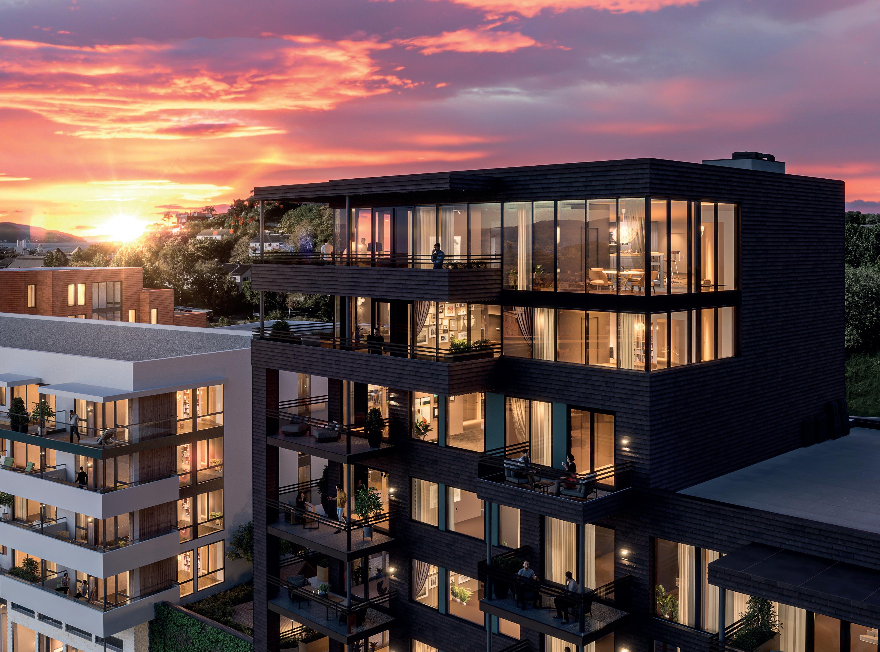 Alle bilder er av illustrativ karakter, endringer vil forekomme. Materialvalg og farger kan avvike og må evnt. bestilles som tilvalg om disse avviker fra standard leveranse angitt leveransebeskrivelsen vedlagt. Utsikt, balkongløsning, rekkverk og vindusløsning er kun illustrativ og vil variere fra etasje til etasje og bygg til bygg. Kjøkkenløsning kan avvike. Se etasjeplaner og kjøkkentegninger vedlagt i den komplette leveransebeskrivelse.