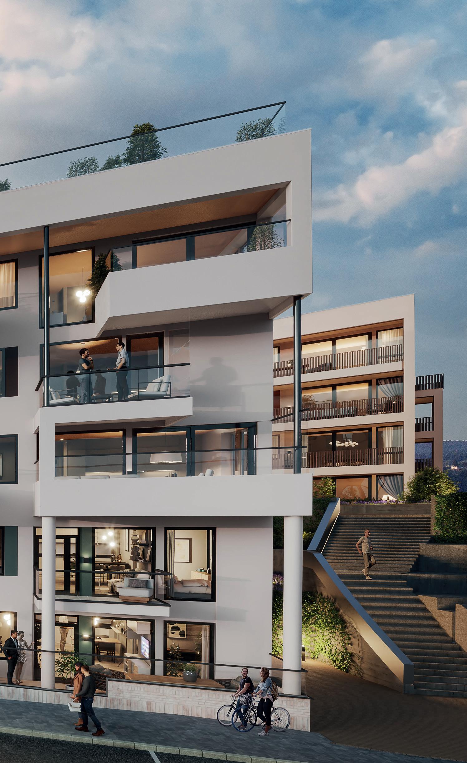 Det første bygget, Bølgen, markerer skillet mellom det historiske og det nye – og starten på bydelstransformasjonen. Selve bygget utgjør overgangen fra luftig gamleby til et tettere sentrum. Og med sine myke og luftige arkitektoniske former signaliserer bygget en velkomst med åpne armer.