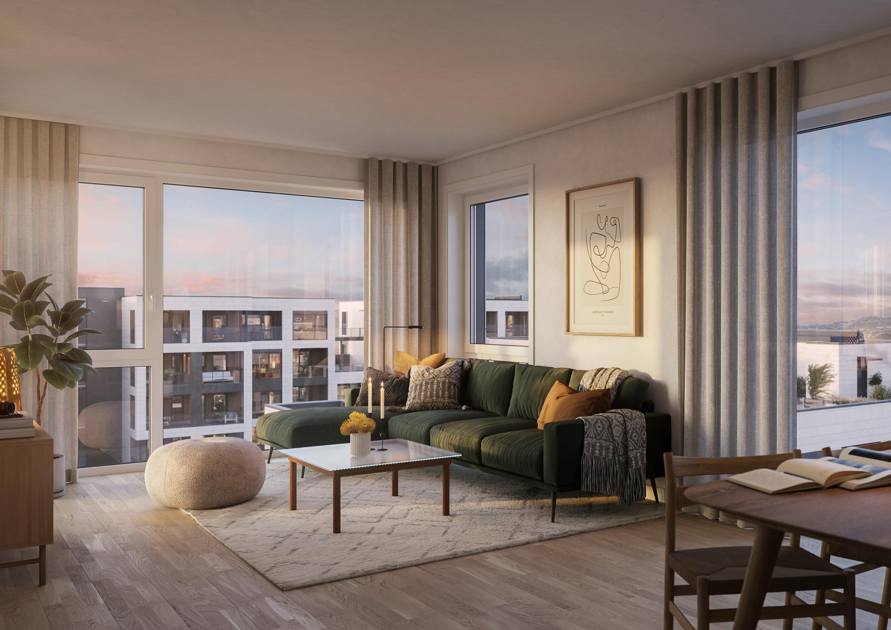 Som beboer har du også tilgang til den felles, grønne takterrassen. Med en slående utsikt, er det et perfekt sted for å samles på en vakker sommerdag for grilling og sosialt samvær for eksempel.
