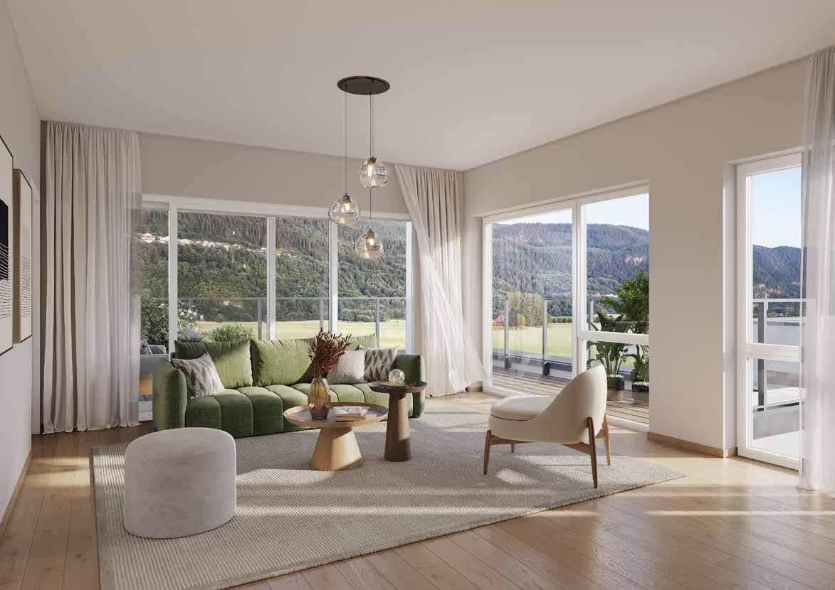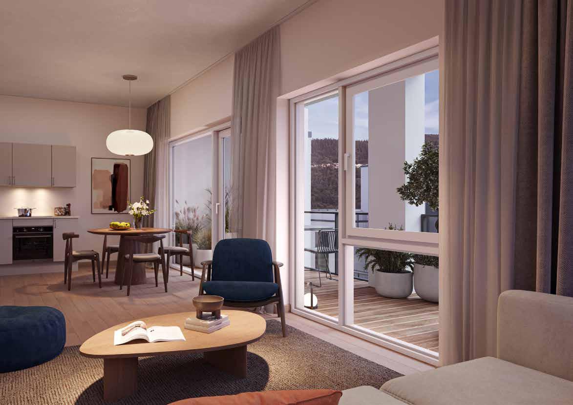 — Her skal det etableres nye boliger som får begge deler – både landlighet og umiddelbar nærhet til sentrum. Her kan du nyte dagene i ny og lettstelt leilighet med gjennomtenkte detaljer og god planløsning. I utformingen av leilighetene og balkongene blir det brukt materialer som skaper en hyggelig, lun og skjermet atmosfære.