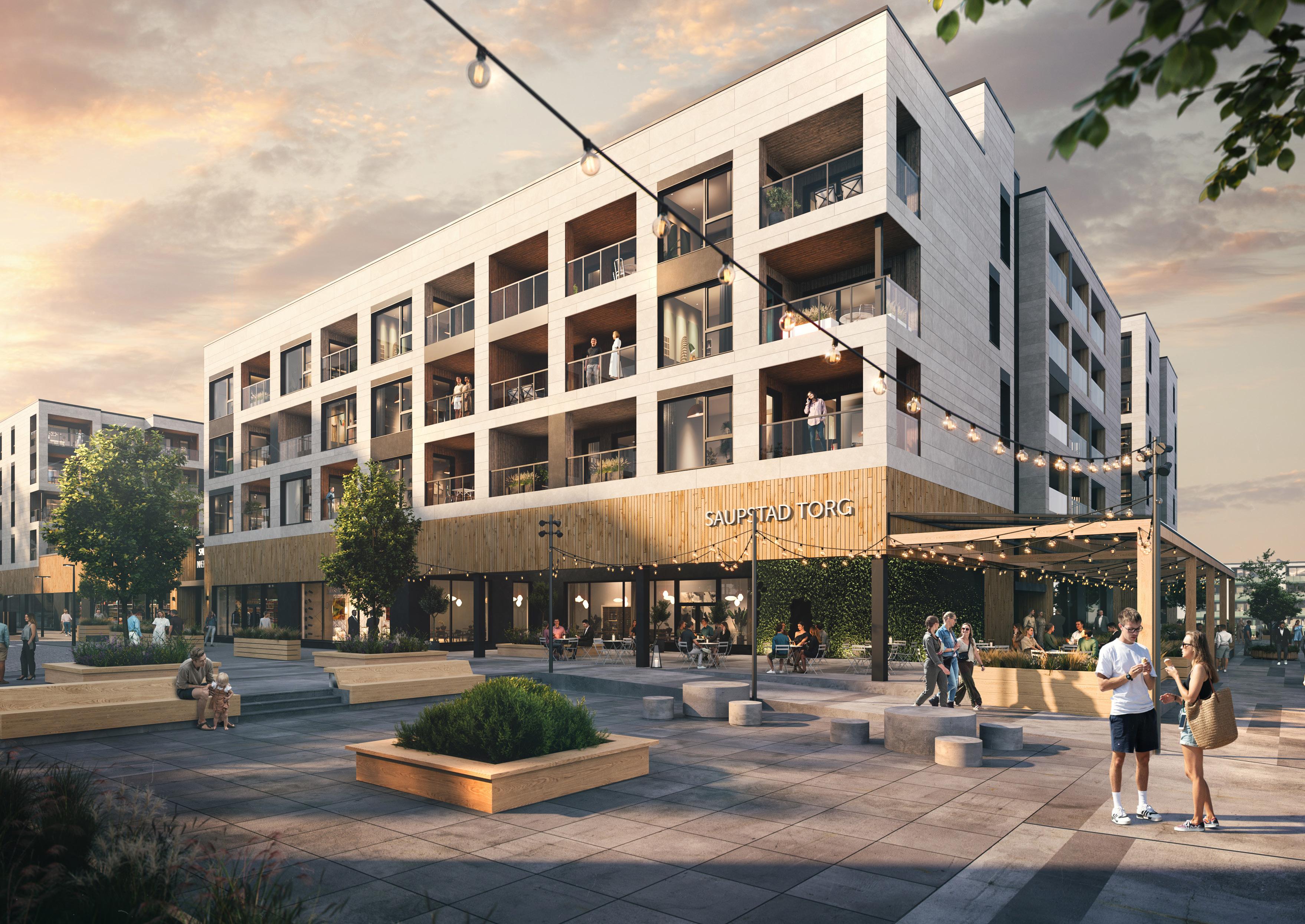 Med flotte leiligheter, uteservering i gågaten og trivelige, grønne uterom er Saupstad Torg et godt sted for å møtes – og leve. Trondheims nye pulserende bydel.