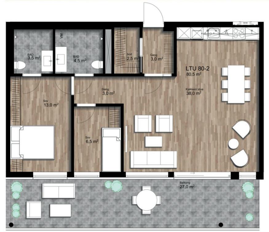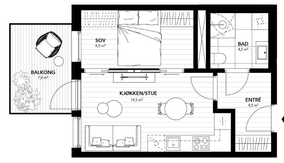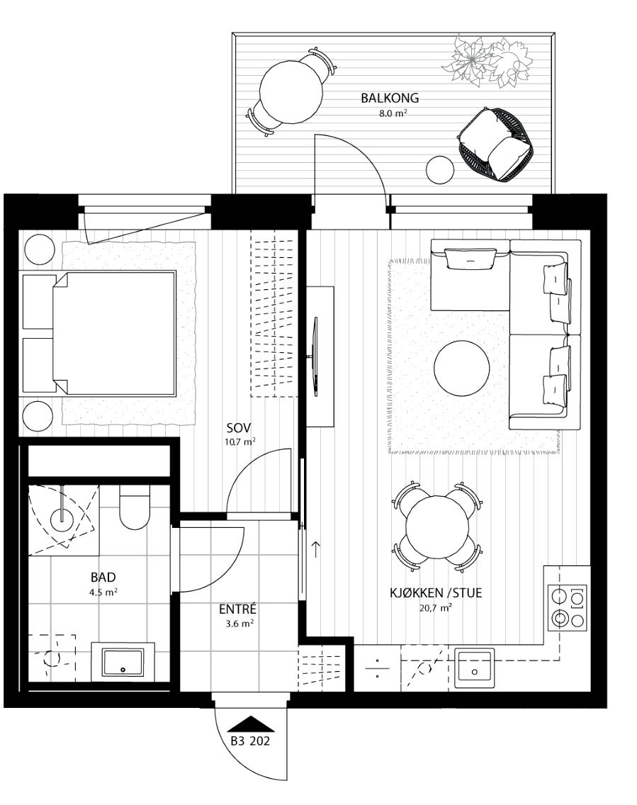 Kundene liker å ha forskjellige typer å velge blant, slik at det er mer sannsynlig at de finner leilighetstypen som passer for seg. Med et spekter på 2-roms fra ca. 30 til i overkant av 40 kvm, så når vi tak i alt fra førstegangskjøperen som er opptatt av enhetspriser, til den godt voksne som ønsker en romslig og praktisk 2-roms. Leilighetstypene er også aktuelle for unge par og enslige voksne. Investorkunden står også for et viktig innslag i 2-roms-segmentet, og dukker gjerne opp som kjøpere på denne leilighetstypen i forhåndssalg/salgsstart.