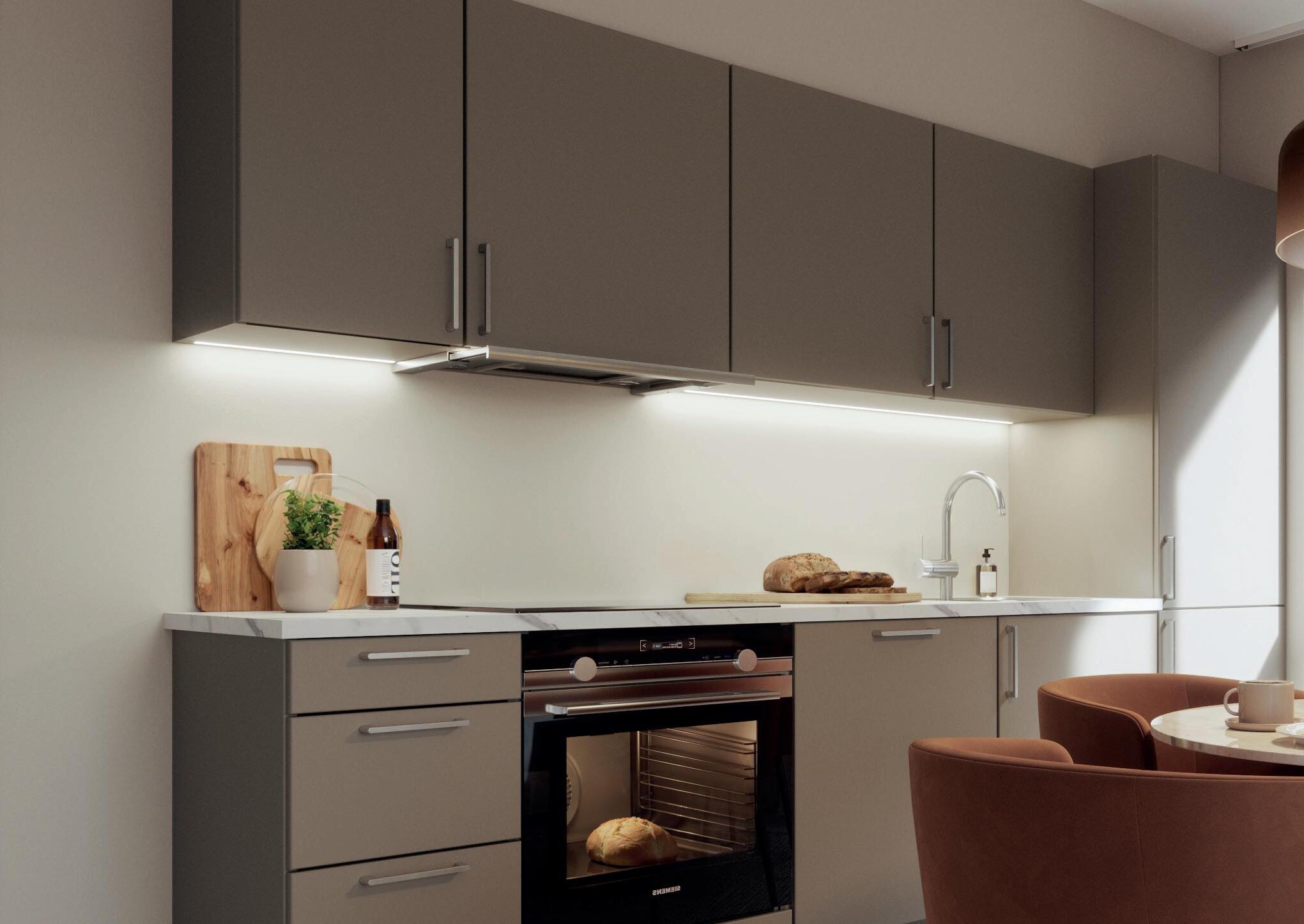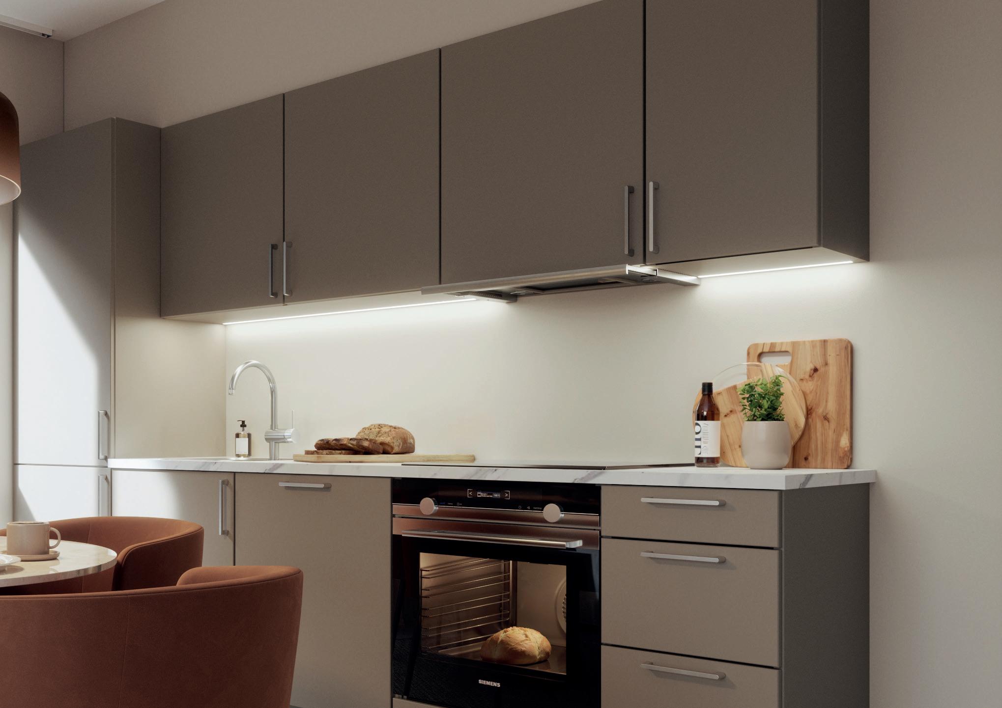 Eventuelt ventilasjonsaggregat i overskap over kokesone for de minste enhetene.