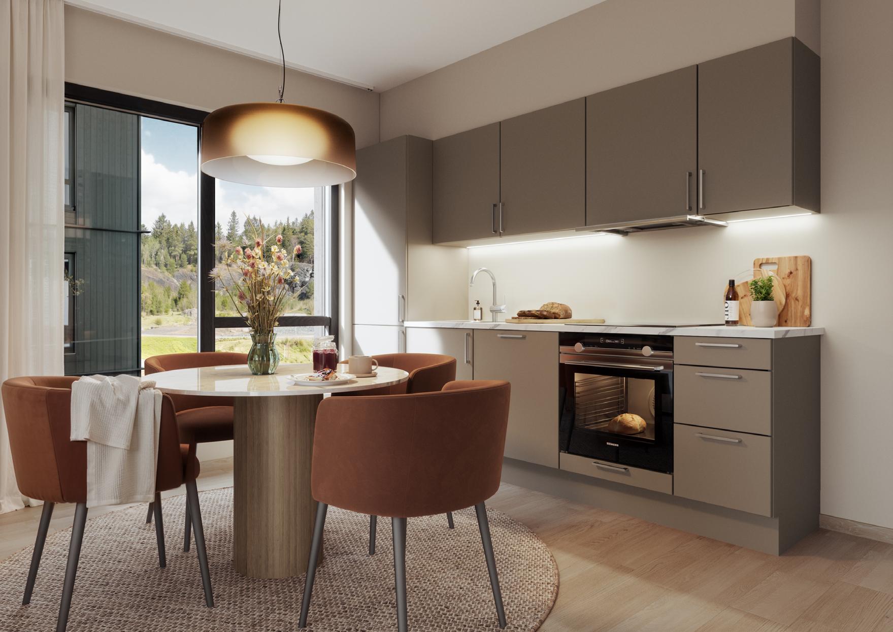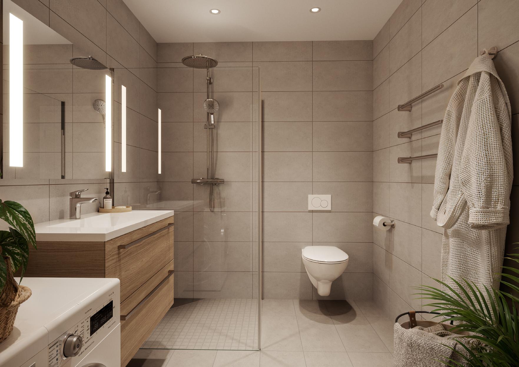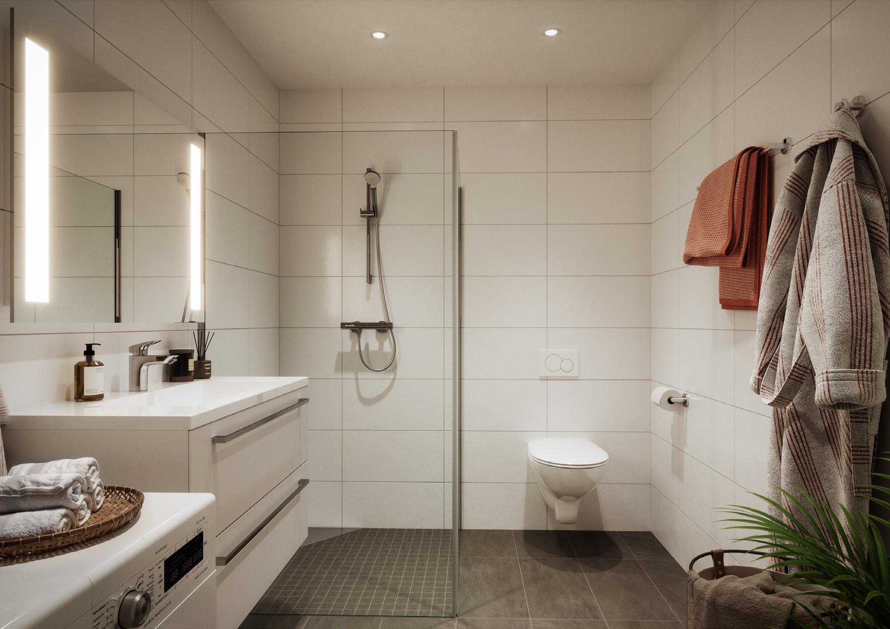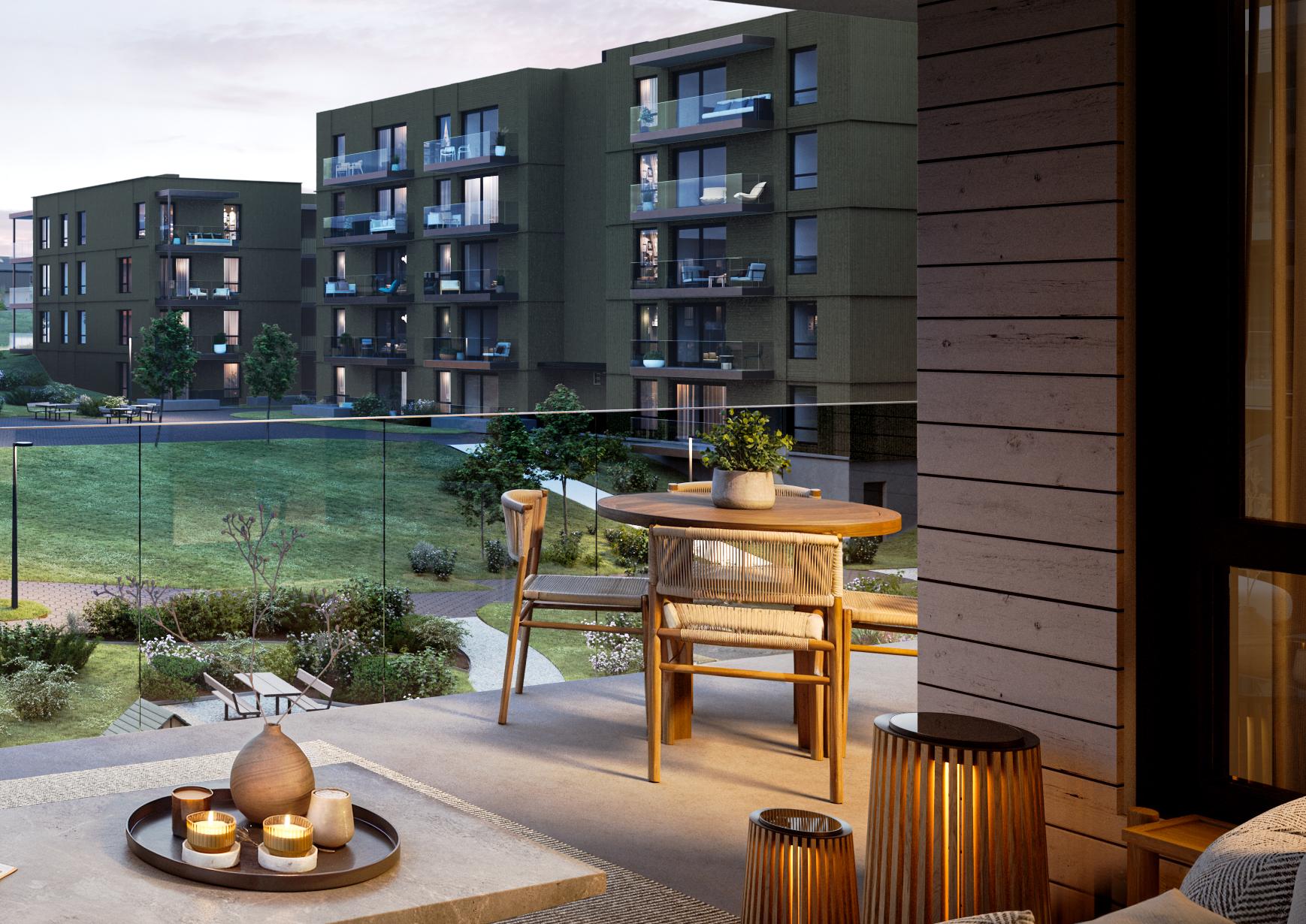 Alle bilder er av illustrativ karakter, endringer vil forekomme. Materialvalg og farger kan avvike og må evnt. bestilles som tilvalg om disse avviker fra standard leveranse angitt leveransebeskrivelsen vedlagt. Utsikt, balkongløsning, rekkverk og vindusløsning er kun illustrativ og vil variere fra etasje til etasje og bygg til bygg. Kjøkkenløsning kan avvike. Se etasjeplaner og kjøkkentegninger vedlagt i den komplette leveransebeskrivelse.