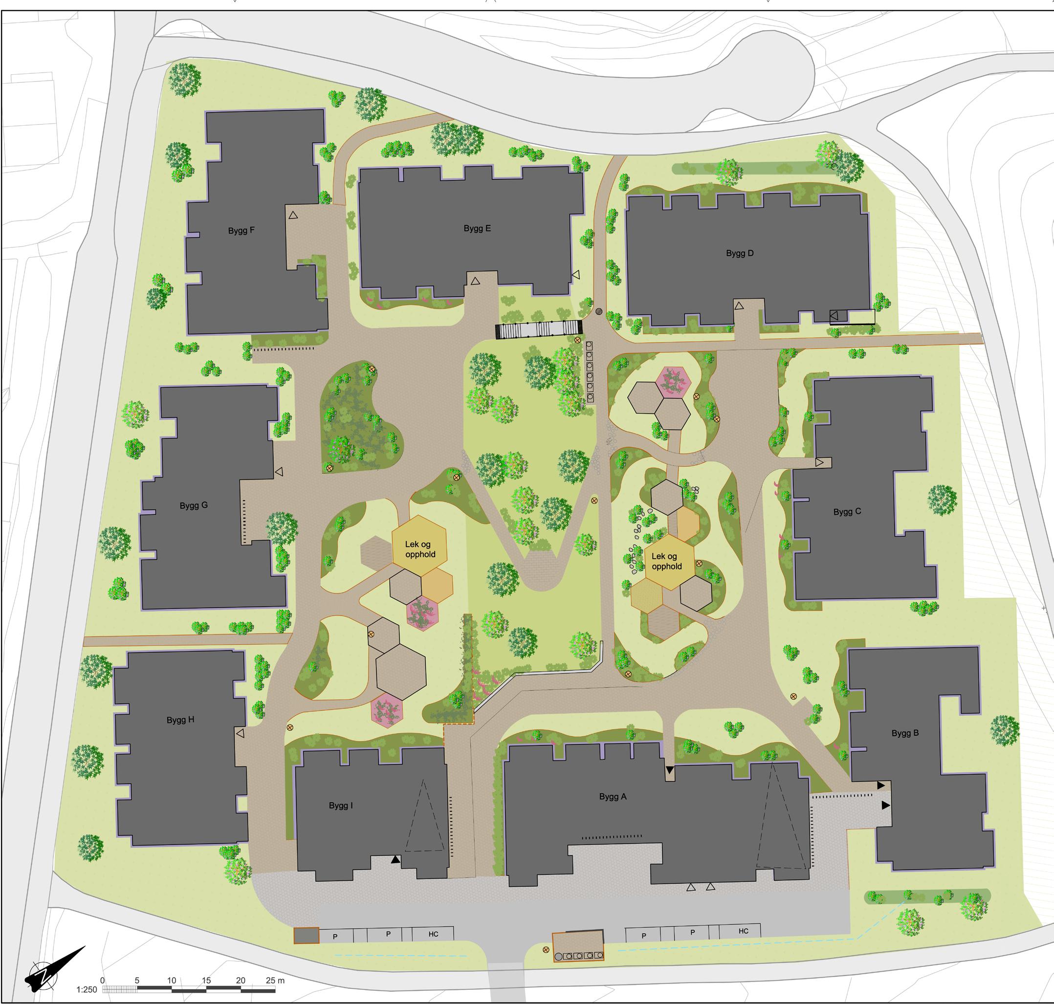 PKA arkitekter har hele veien hatt et tett samarbeid med landskapsarkitekten for å sy inne- og uterom sammen slik at hele anlegget henger sammen med omgivelsene på en god måte. Uterommet er nøye planlagt med forskjellige nivåer og soner for opphold, og tilbyr både sosialisering, privat avslapping og lek. Mellomrom mellom husene er et viktig grep for sikt og luft gjennom tomten. I tillegg til et stort og godt uterom tilbyr leilighetene fine balkonger med gode solforhold.