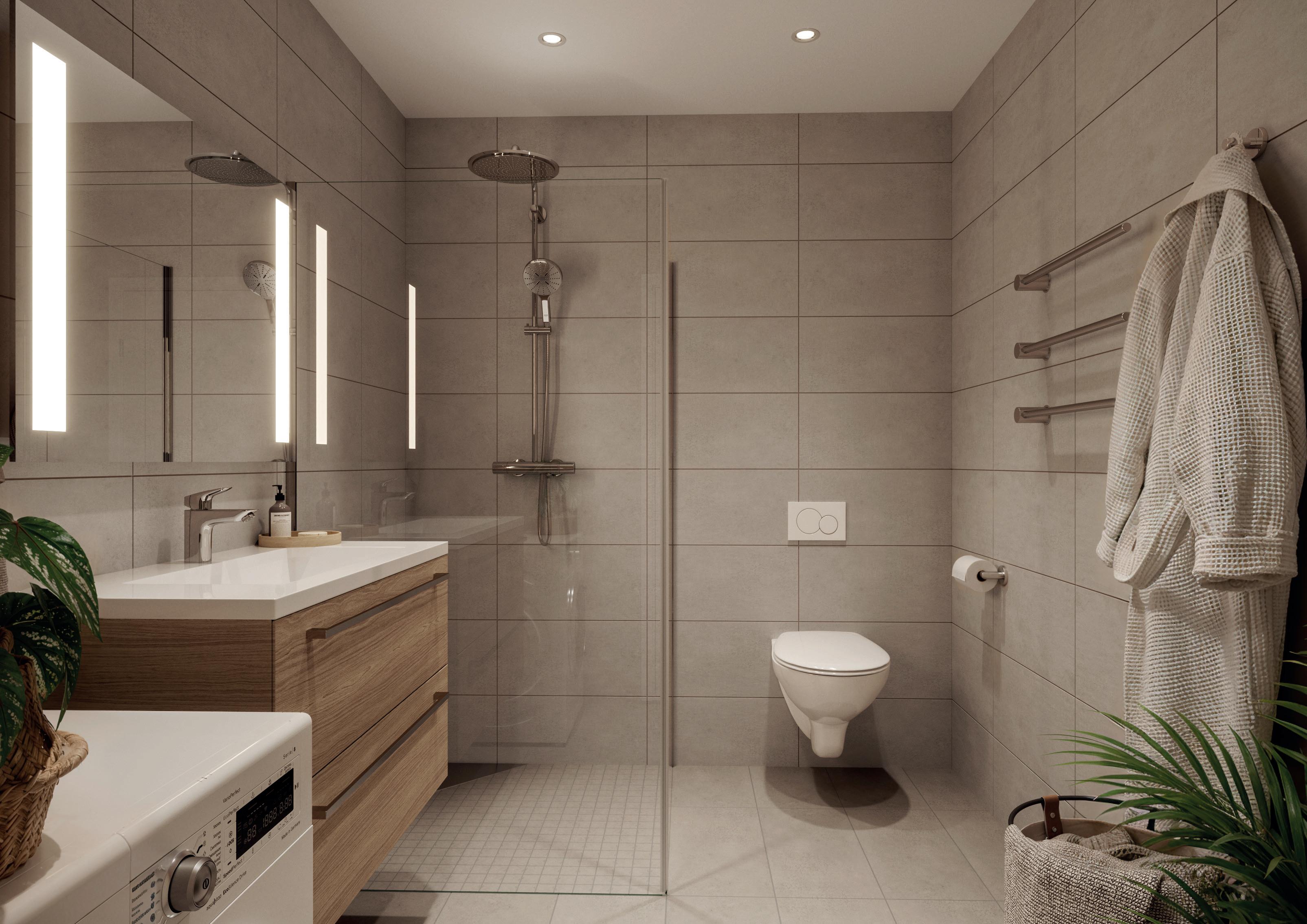 Alle bilder er av illustrativ karakter, endringer vil forekomme. Materialvalg og farger kan avvike og må evnt. bestilles som tilvalg om disse avviker fra standard leveranse angitt leveransebeskrivelsen vedlagt. Utsikt, balkongløsning, rekkverk og vindusløsning er kun illustrativ og vil variere fra etasje til etasje og bygg til bygg. Kjøkkenløsning kan avvike. Se etasjeplaner og kjøkkentegninger vedlagt i den komplette leveransebeskrivelse.