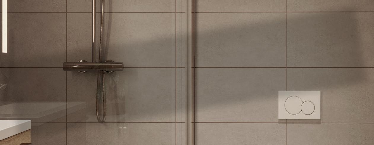 Gulv: Flis, grafitt 30 x 60 cm, grafitt 5x5 cm på gulv i dusjsone
