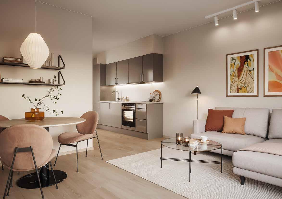 Alle bilder er av illustrativ karakter, endringer vil forekomme. Materialvalg og farger kan avvike og må evnt. bestilles som tilvalg om disse avviker fra standard leveranse angitt i leveransebeskrivelsen vedlagt. Utsikt, balkongløsning, rekkverk og vindusløsning er kun illustrativ og vil variere fra etasje til etasje og bygg til bygg. Kjøkkenløsning kan avvike. Se etasjeplaner og kjøkkentegninger vedlagt i den komplette leveransebeskrivelse.