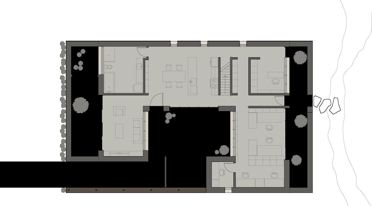 Initial Parti Diagram, denoting the three primary programs on the first floor and the main path of circulation which acts as the “spine” of the house