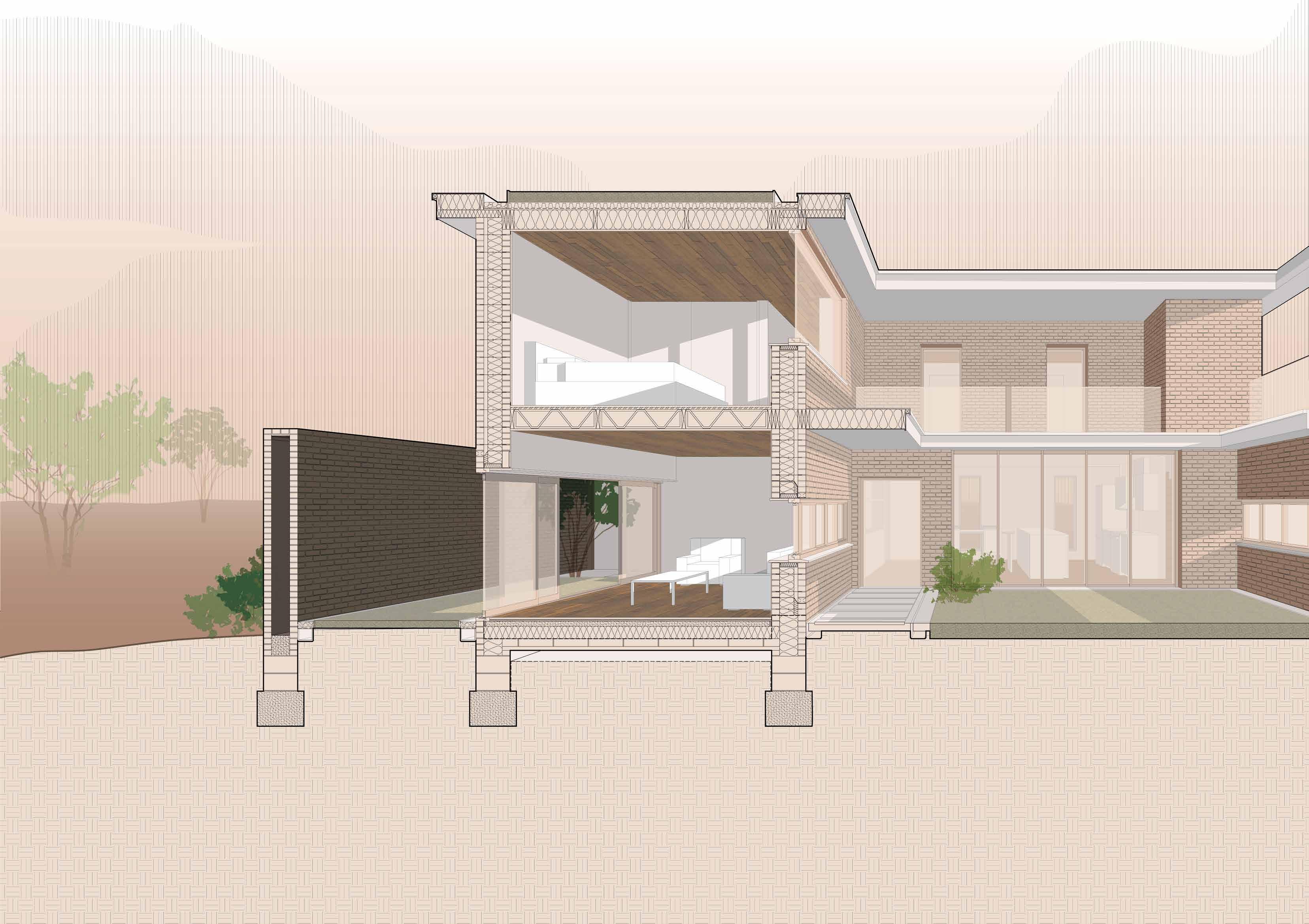 Sketch visualization of the complementary courtyard spaces employed on the East and West ends of the house