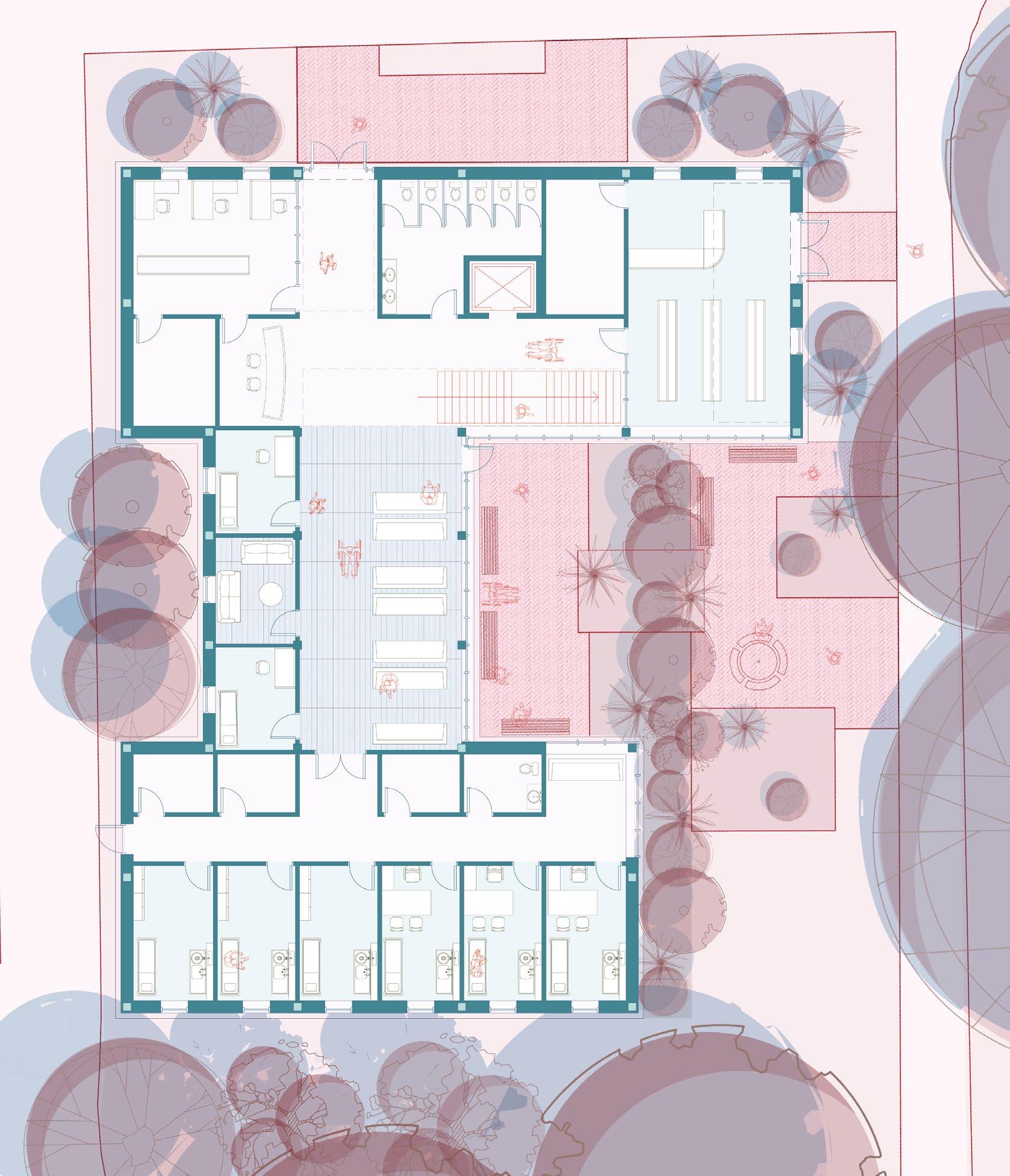 The site features three fully-grown trees which dictated the form of the design. The area beneath the trees is a courtyard that provides patients with an exterior resting place lush with greenery. The building wraps around the courtyard from the west side. Large windows placed around the inner side of the building provide patients with views of the courtyard letting indoor occupants connect with nature.