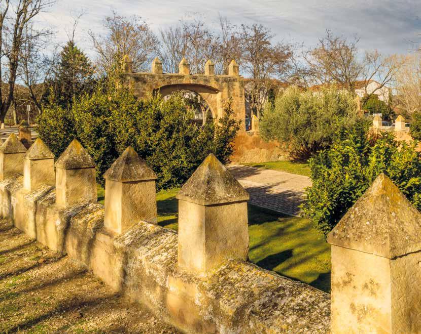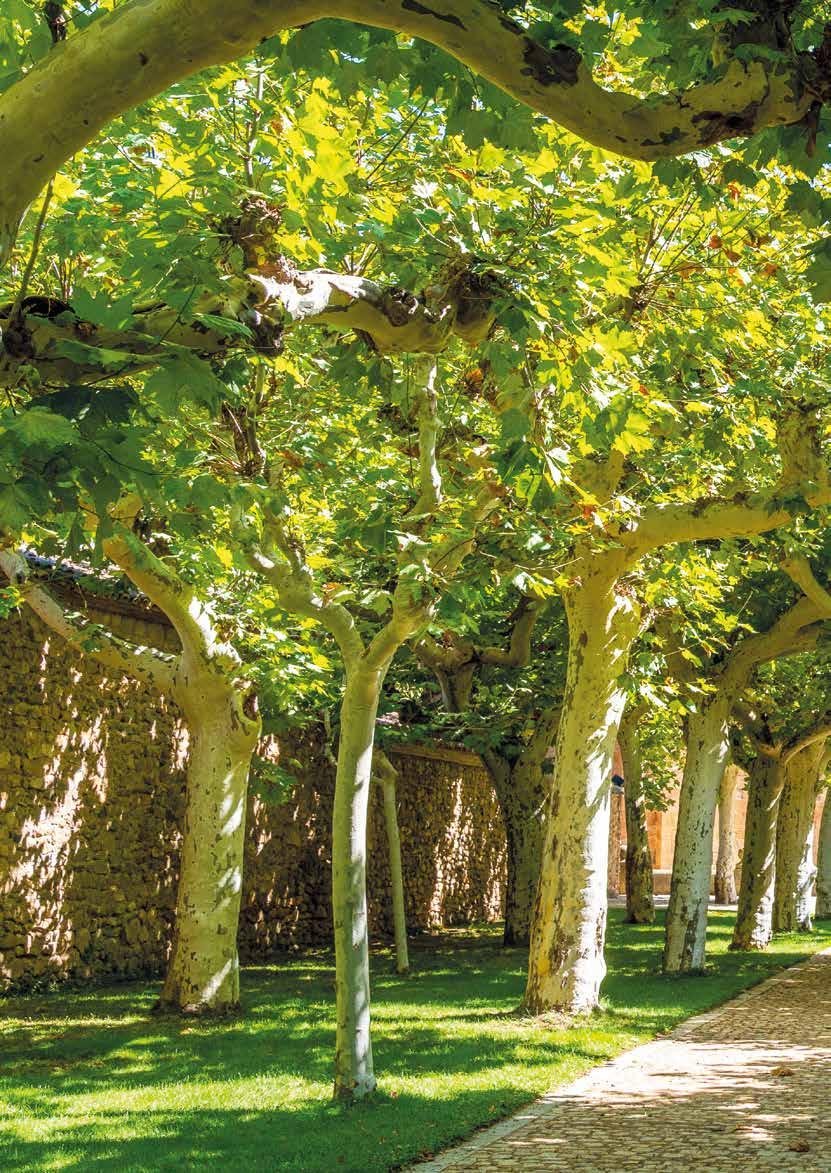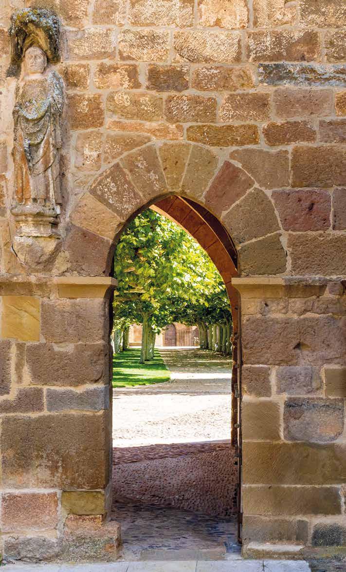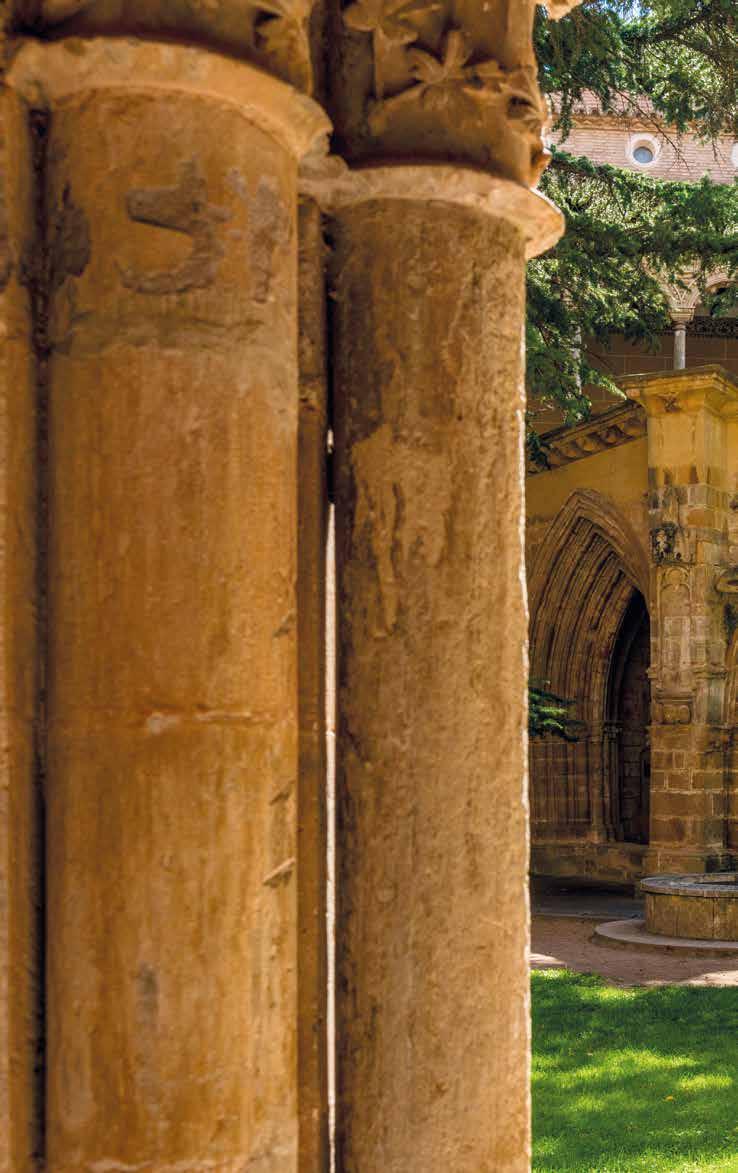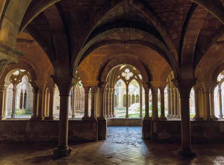 NÄR DU KOMMER FRAM möts du av en kilometerlång mur. Innanför den hade munkarna allt de behövde. Där fanns: vattnet, kvarnen och köksträdgården. När du har passerat muren hittar du en sval trädkantad gångväg som leder till dörren till den sobra men katedralsliknande kyrkan, som det tog 250 år att bygga. Därifrån kommer man till den levantinska gotiska klostergången, med kapitäldekorerade pelare med växter i cisterciensernas stil.