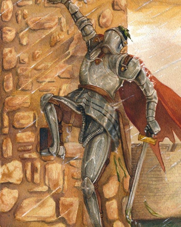 Errol climbs out of the moat. He climbs up the castle wall. He’s cold and wet. But he’s brave and strong. He can save Princess Bella.