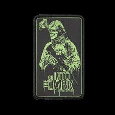 Haftowany patch ze szkieletem w oporządzeniu taktycznym. Patch ma na odwrocie rzep, który pozwala na przyczepienie do sprzętu lub odzieży.