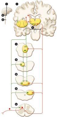 Hoy es ampliamente aceptado que existen mecanismos endógenos que disminuyen el dolor por “inhibición” neta, y que la intensidad del dolor puede depender de un circuito modulador descendente que recibe información de numerosas regiones (incluidas hipotálamo, amígdala y corteza cingulada anterior rostral [rACC]), conecta en el mesencéfalo con la sustancia gris periacueductal (PAG) y se proyecta de PAG a la médula. Asimismo, se ha demostrado que las neuronas del núcleo magno del rafe y el núcleo reticular gigantocelular, contenidas en la médula ventromedial rostral (RVM), se extienden a las astas espinales o dorsales de la médula, donde, directa o indirectamente, aumentan o disminuyen el tráfico nociceptivo y modifican la experiencia dolorosa.