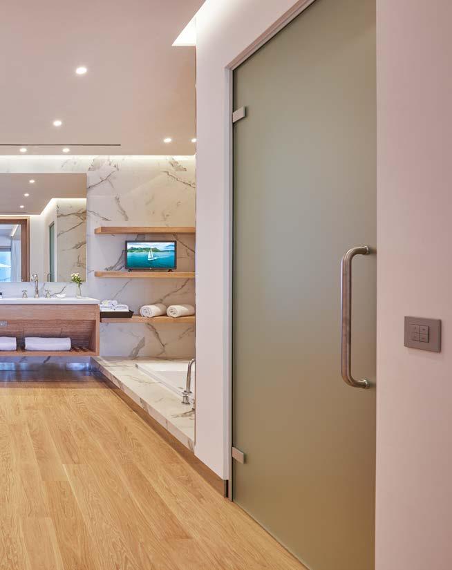 A sunken bath beckons with its promise of serenity, the purple-tinged shower enchants, and the built-in television turns every moment into a spa-like indulgence