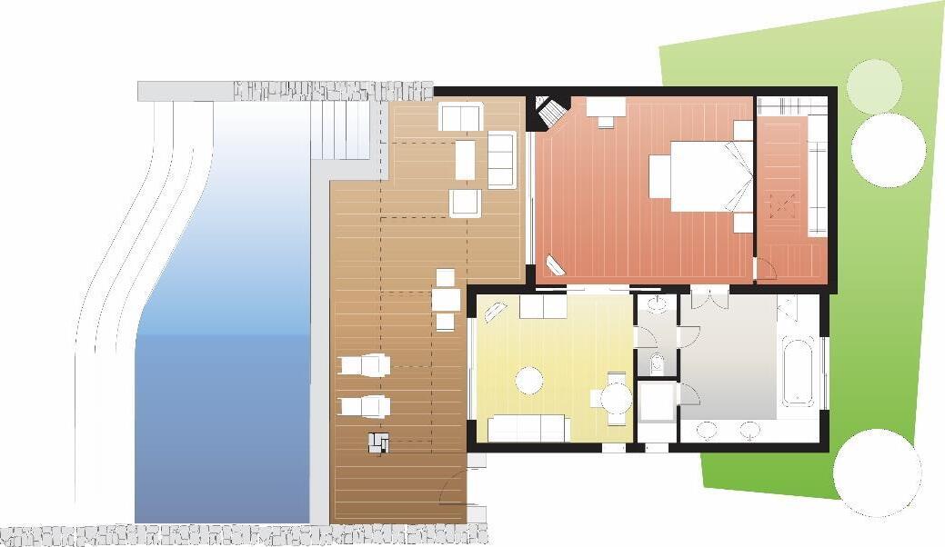 Mediterranean Bungalows feature an open plan style bedroom with a sitting area that leads directly to the wooden terrace, a marble lined bathroom with separate glass-enclosed shower/steam bath and air bathtub.