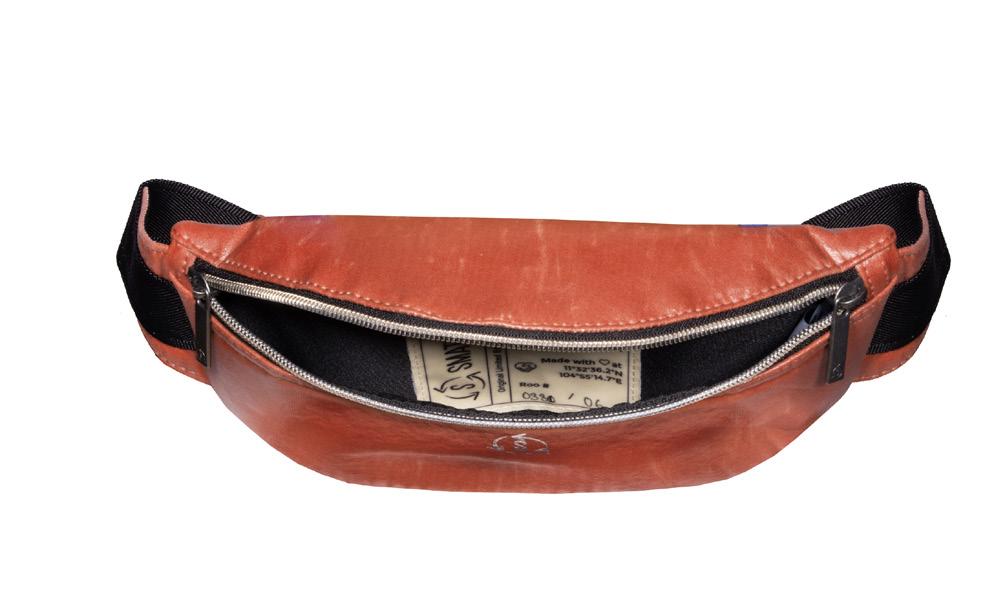 The go-getter Bustle has a large outside pocket with a zipper. Inside, there are two open pockets, and a pocket with a zipper. It also features an adjustable, snap hook strap. Handmade from repurposed industrial net.