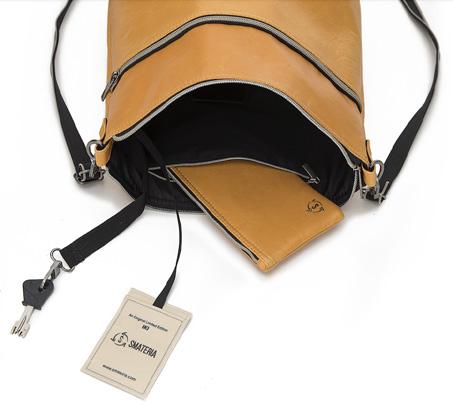 Front the top, with a zippered main compartment that includes two internal zip pockets and two accessory pockets. From the side panel you can slip slimmer items and zip them up. A secret side compartment giving even more tuck away space.