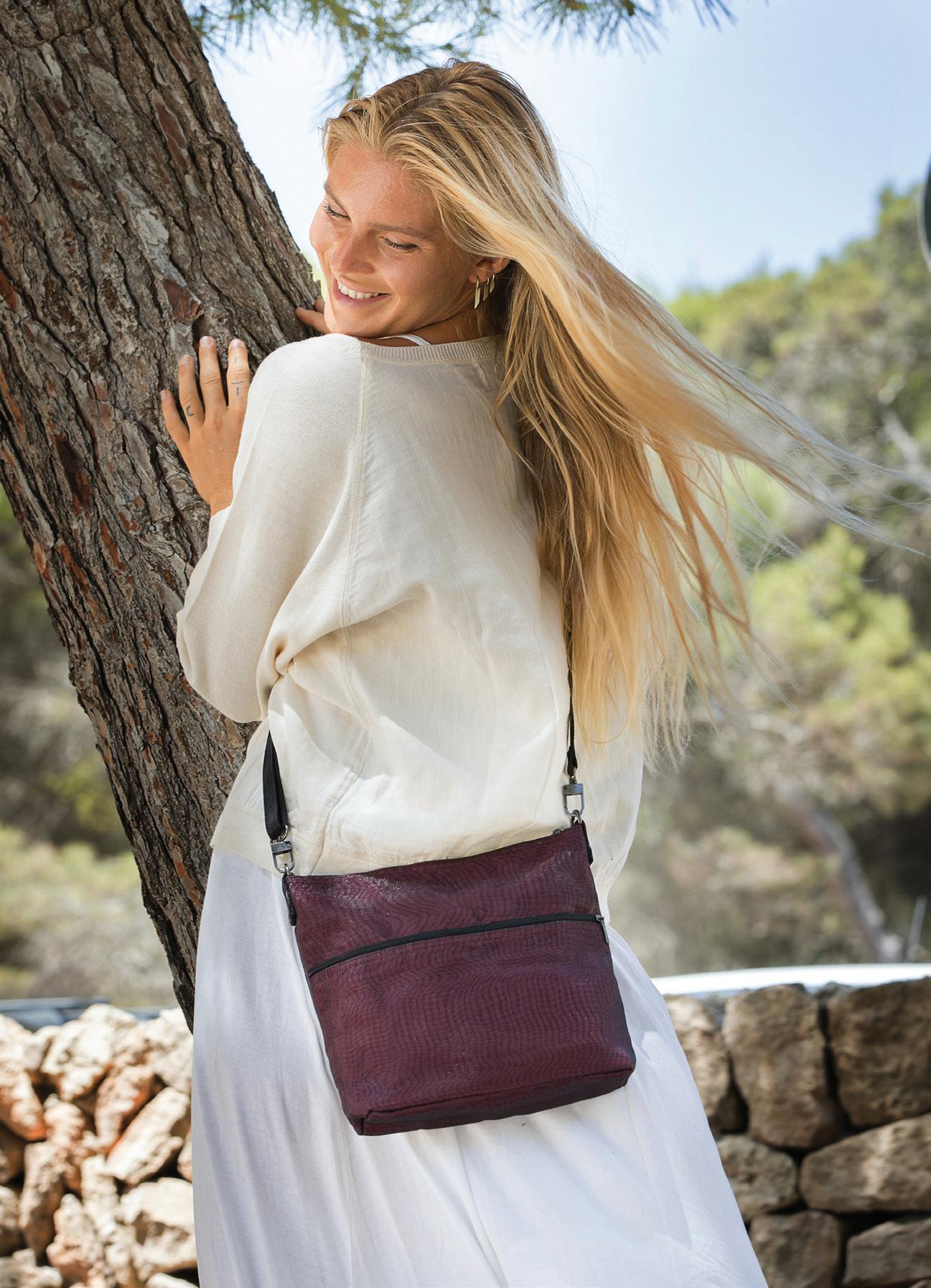 Treat yourself to the stylish, easy to wear, and easy to carry Nearby crossbody bag. The Nearby has more room than the Hip bag and features two zippered compartments, one open compartment in the middle, and a bonus zip pocket on the outside. Handmade from repurposed industrial net.