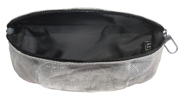 A fun and chic way to store your sunglasses. The interior is lined and durable to keep your items safe. The Wink also features a strap on the back to put through a belt, zippered closure, and a snaphook for easy attachment to another tote or purse. Handmade from repurposed industrial net.