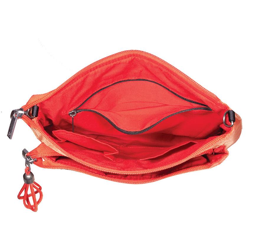 The go-getter Bustle has a large outside pocket with a zipper. Inside, there are two open pockets, and a pocket with a zipper. It also features an adjustable, snaphook strap. Handmade from repurposed industrial net.