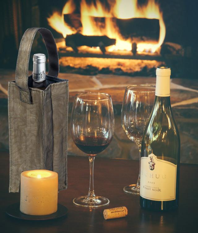 A wine tote, cheeseboard, wine opener, wine stopper, set of 4 bamboo coasters in a holder, and 8.5 oz. soy candle.