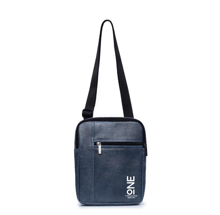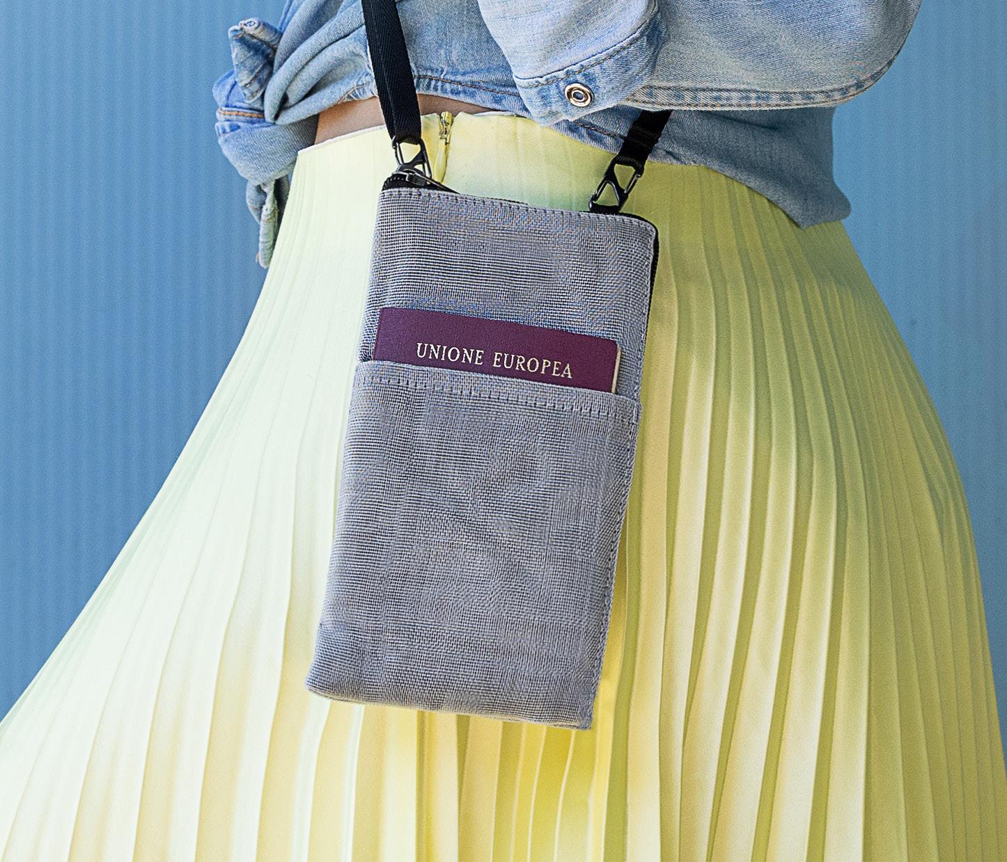 A minimalist crossbody bag with convenient phone storage. Features a zipper pocket and an open pocket with a snap on the outside, a phone pocket and a pocket with a zipper on the inside, an adjustable shoulder strap, and a snaphook for keys. Available in both netting and IKI materials. Brandable with company logos and art.