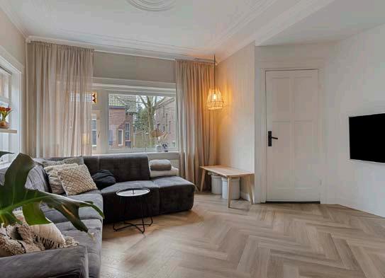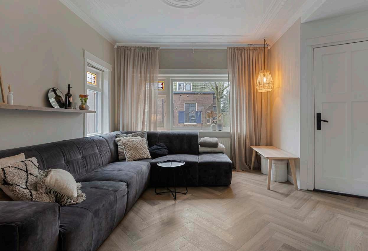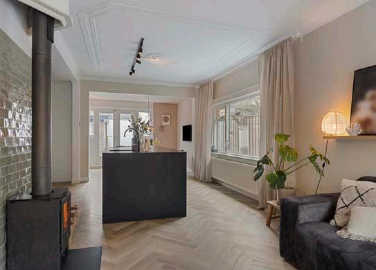 Bij binnenkomst vallen de typische jaren ‘30 elementen op in de vorm van een granietvloer, glasin-lood-ramen en de prachtige ornamenten in het plafond, in combinatie met een moderne afwerking en inrichting met een stijlvolle visgraat pvc-vloer en rustige sfeervolle kleuren op de wanden. De lichte en ruime woonkamer loopt door naar de luxe open keuken en de gezellige eetkamer. Met een woonoppervlakte van 106 m² biedt deze ruimte genoeg plek voor al je woonideeën. De grote ramen zorgen ervoor dat het licht binnenstroomt en creëren een uitnodigende sfeer die je meteen thuis doet voelen. Het is gemakkelijk om hier je eigen stijl toe te voegen en van deze ruimte een plek te maken waar je elke dag van geniet.